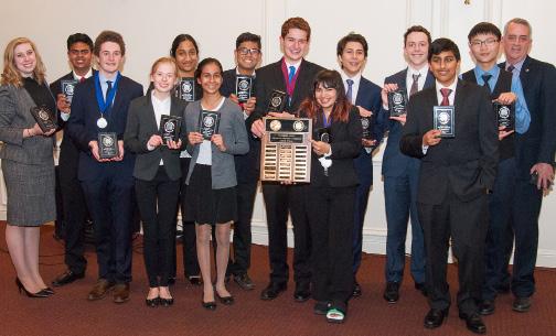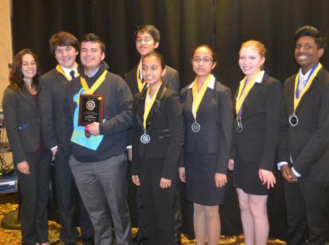 March 2014. Coach Jeanine Boyers (far left) and some members of the team at the Sacramento County awards ceremony, where Country Day received the 4th-place plaque. (l to r) Grant Miner ‘15, George Cvetich ‘15, Arvind Krishnan’17, Shriya Nadgauda ‘17, Aishwarya Nadgauda ‘15, Emma Belliveau ‘16, and Akilan Murugesan ‘16.