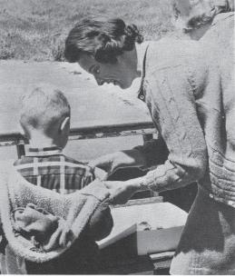 Hot Dog Day 1966. Betty Kanner, president of the Parents’ Association, serves lunch to a young student.