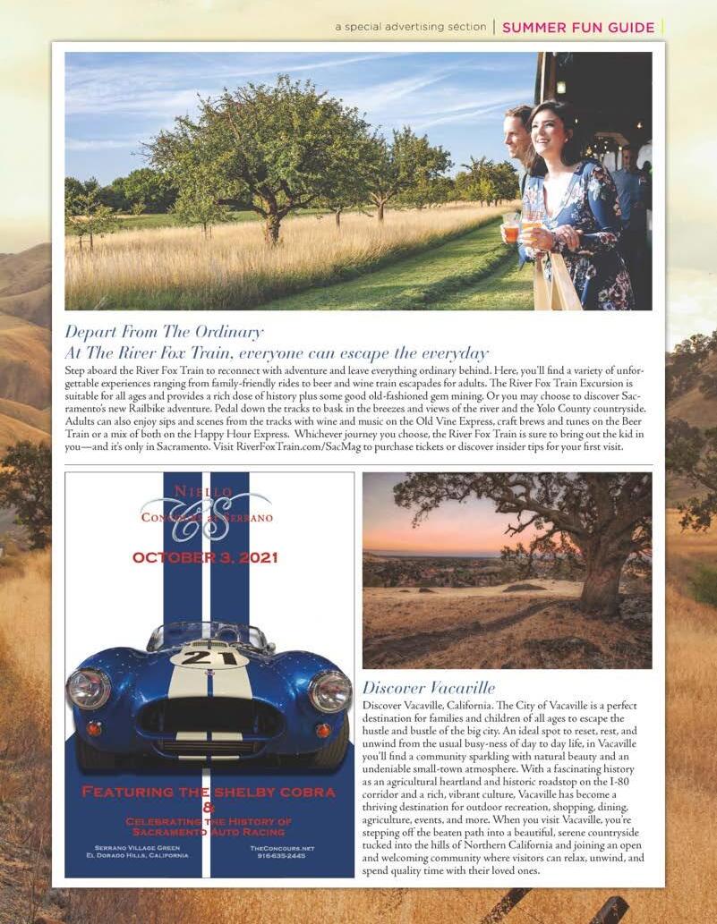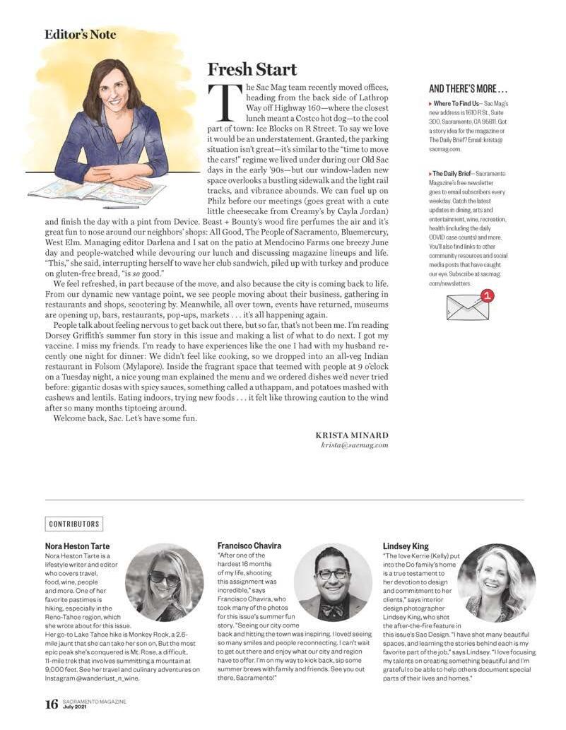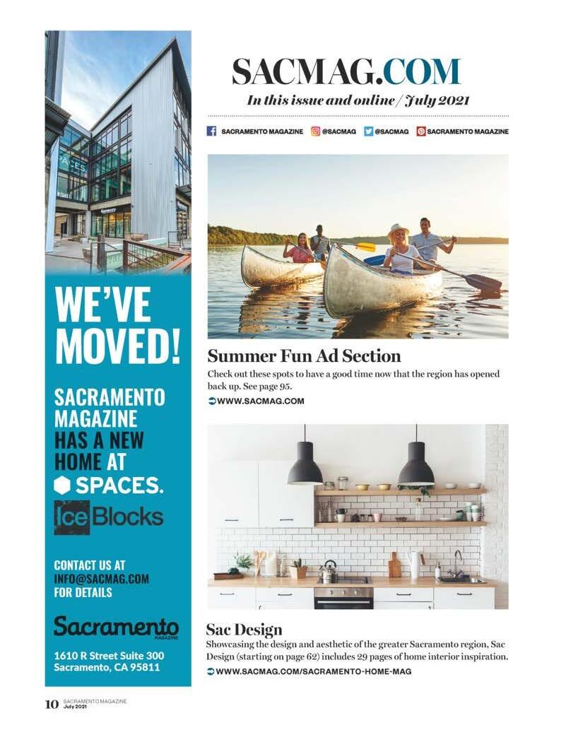Proudly presenting the July 2021 issue of Sacramento Magazine. Our magazine is full of local stories about what's going on in our community. This month's cover feature is all about Summer Fun. Get ready to explore, cruise, float, sip, dine and dance in Sacramento. Also, get outdoors with RENO_TAHOE HIKES. Check out 9 great hikes that vary in length and difficulty. In this issue we welcome the debut of Sac Design. A stylish home magazine folded into the pages of Sacramento Magazine featuring FRESH STARTS—Homes that work beautifully.