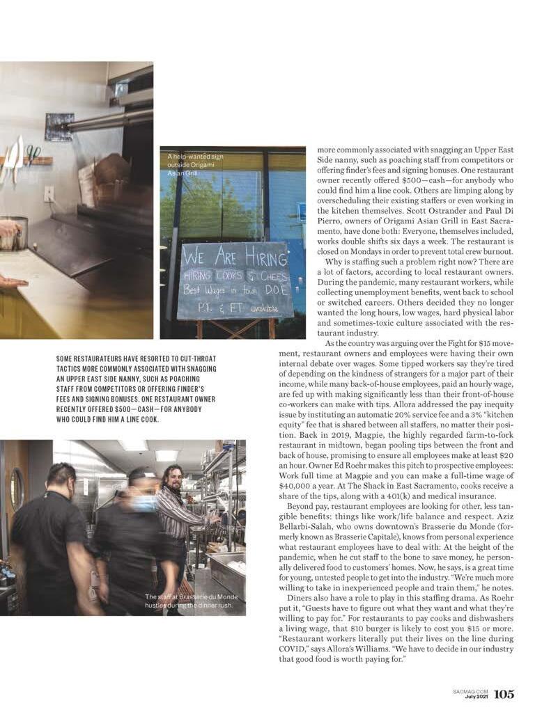Other features and stories include: BRAVO—Connecting through laughter; TASTE/Help Wanted—Restaurants confront the crisis of hiring staff in a post-pandemic world.