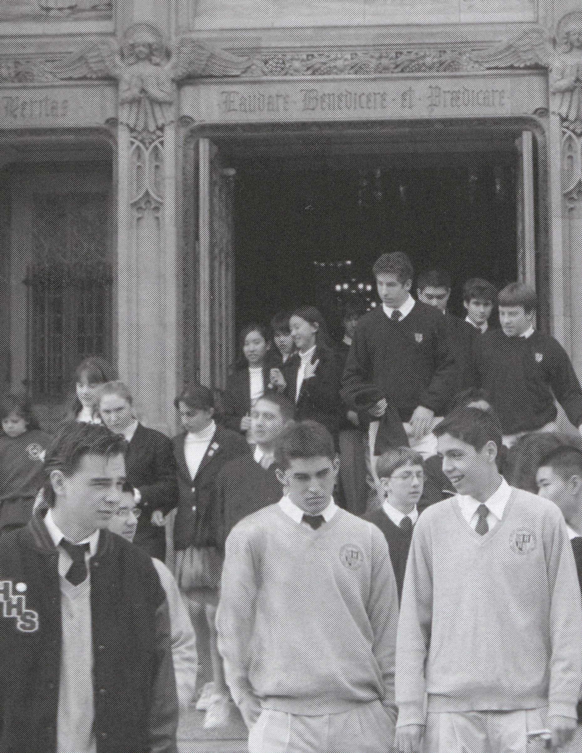 Students exit St. Dominic’s Catholic Church following the 2004 All-School Liturgy, as featured in the 2005 Stuart Hall High School yearbook.