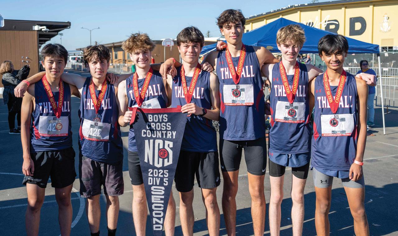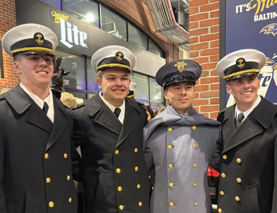 An impressive cohort of recent alumni are currently enrolled at U.S. service academies. At the 2025 Army-Navy game in Baltimore, Maryland, four Stuart Hall graduates reunited to cheer on their respective institutions. From left to right: Rhett Sypult ’25’21, United States Naval Academy; Liam Donohue ’24, United States Naval Academy; Eric Lee ’24, United States Military Academy at West Point; and Cole Sypult ’23’19, United States Naval Academy.