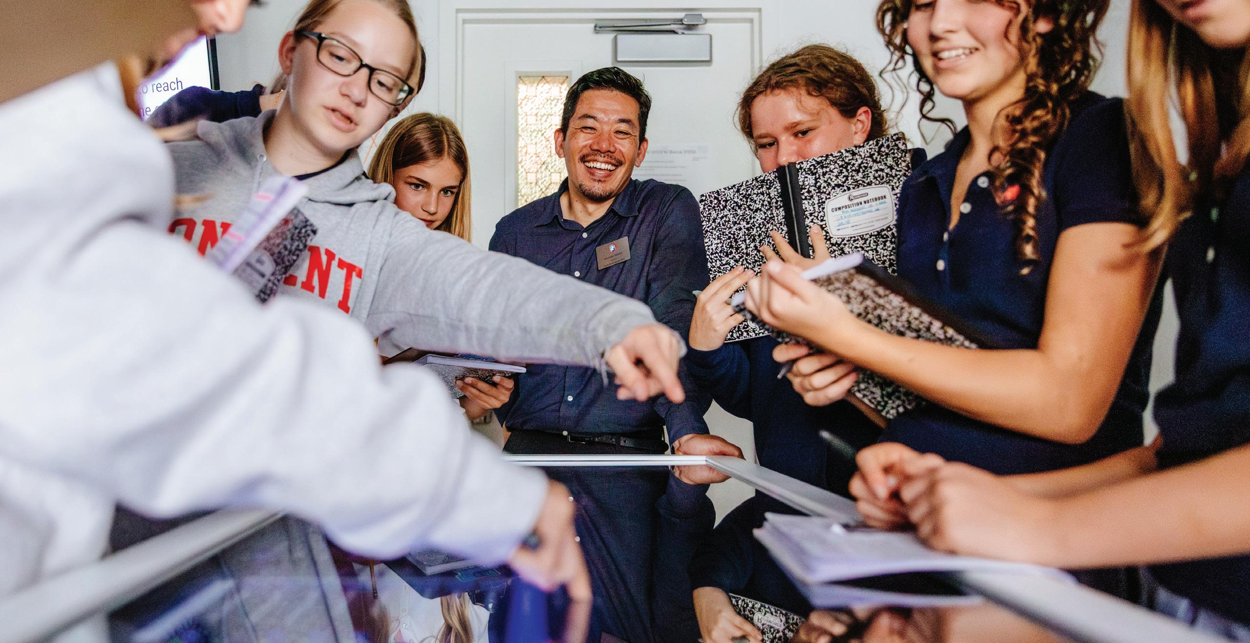 Elementary science teacher Shintaro Tatebe guides eighth-grade biology students through an activity on the Anatomage Table.