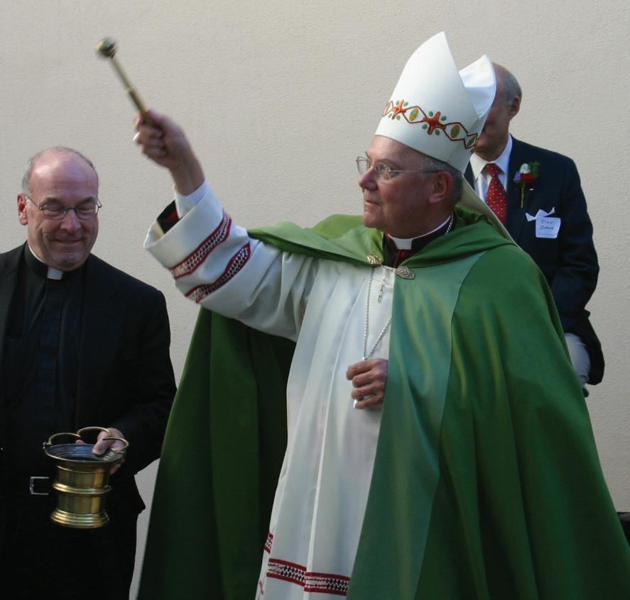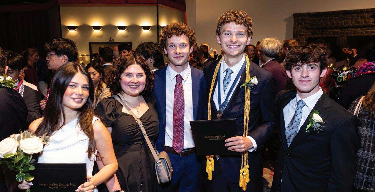 Below: Cardinal William J. Levada (1936–2019), then Archbishop of San Francisco, offers a blessing at the Stuart Hall High School building dedication in September 2002. Class of 2005 alumni and Gordon Sharafinski, the first Head of Stuart Hall High School, at the alumni celebration in June 2025.