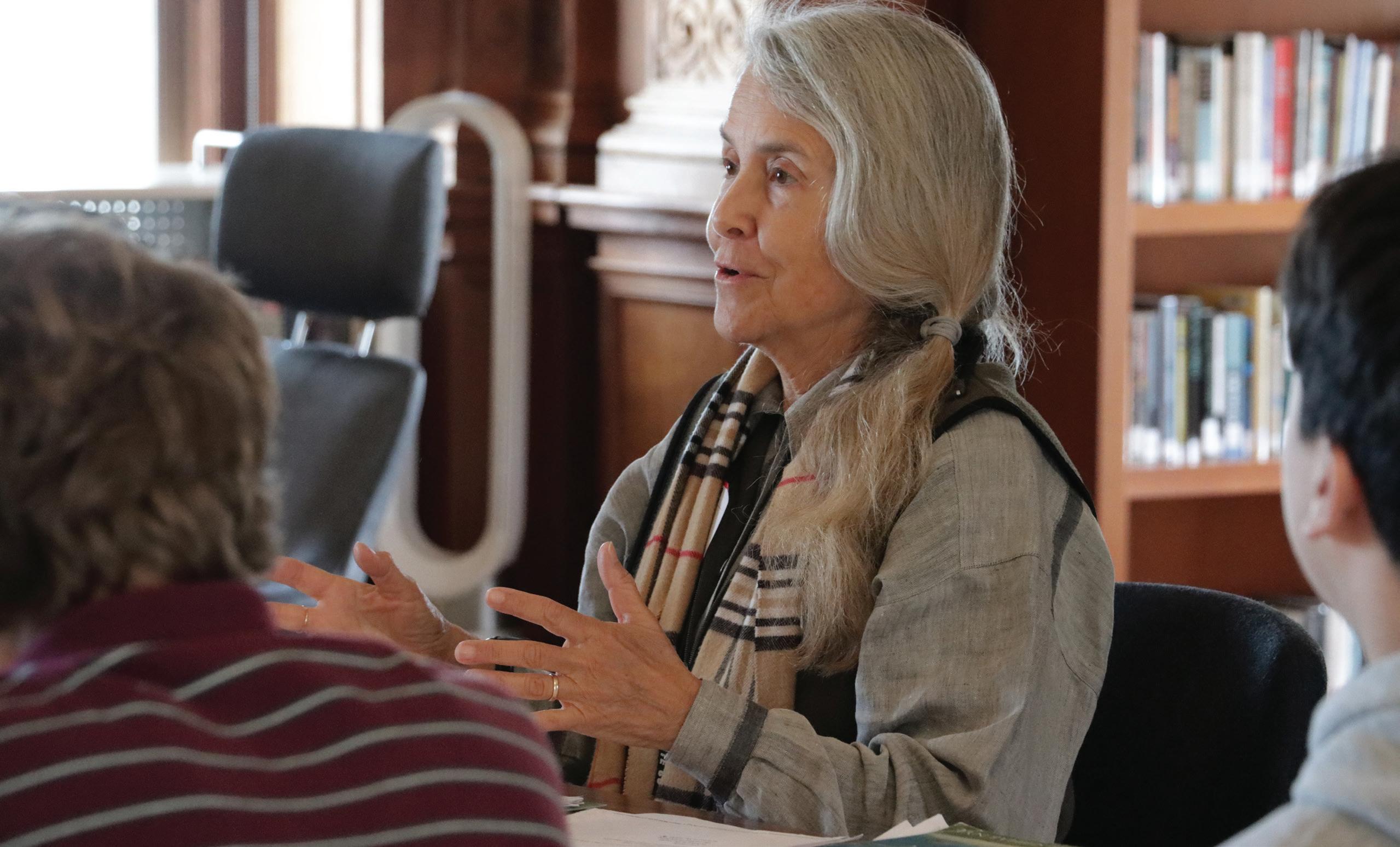 Naomi Shihab Nye works with students in the Mother Williams Library.