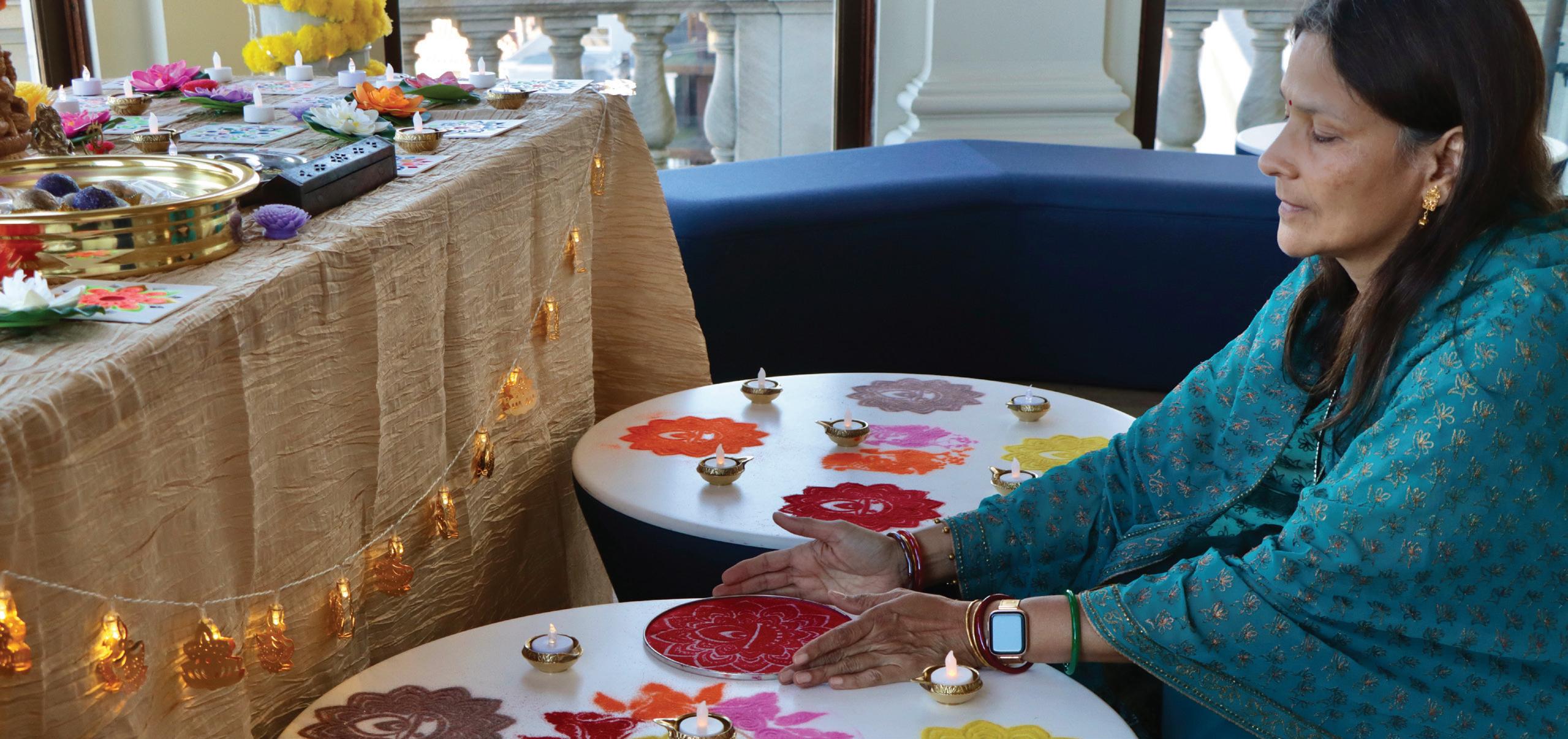 Left: In the Mary Mardel, RSCJ Chapel, Convent high schoolers present during a Grades 9–12 Chapel that explored interfaith traditions and celebrated the High Holy Days and Latinx heritage. Below: Mihu Bisaria, Human Resources Director, creates a rangoli for the Diwali altar in the Main Hall.