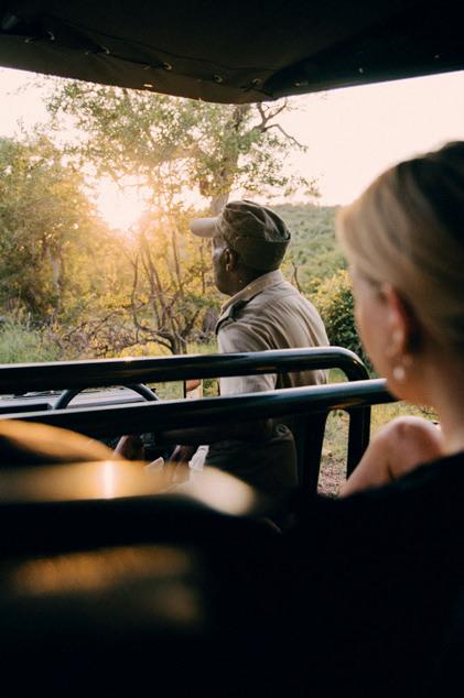 “sundowner”, mens vi nyder de fantastiske lyde og dufte fra bushen og dens planter og dyr, indtil turen går tilbage til lodgen, hvor middagen venter.