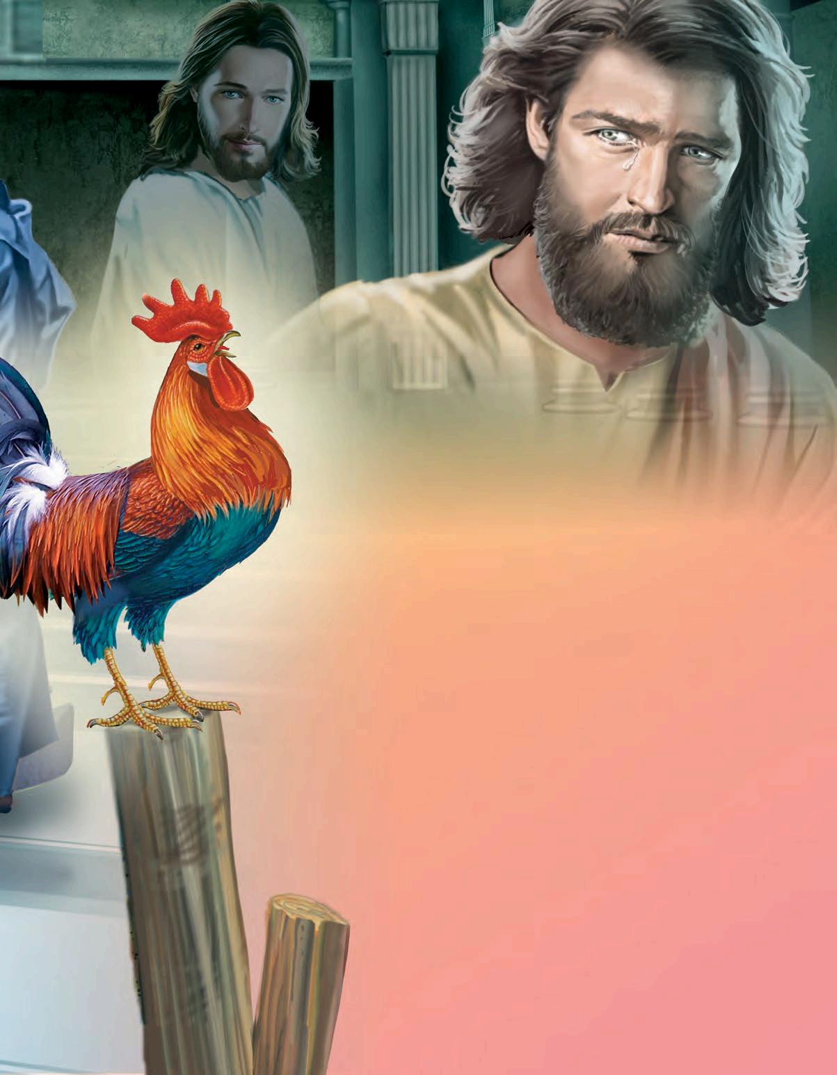 Ce fut alors qu’il entendit le coq chanter. Quand il se tourna vers Jésus, qu’on emmenait devant Pilate, les yeux de Pierre rencontrèrent les siens. Il se rappela ce que lui avait dit le Seigneur dans le jardin, qu’il le renierait trois fois avant que le coq ne chante. Pierre se rendit compte de
