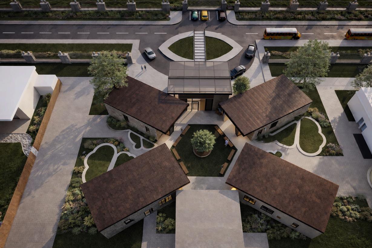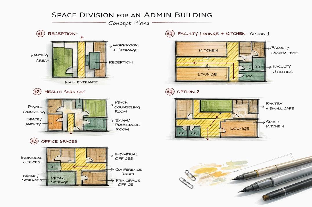 The administration building is conceived as a hexagonal structure organized around a central hub, from which four programmatic wings radiate, creating a clear hierarchy, intuitive wayfinding, and efficient circulation Each wing is dedicated to a specific function including reception, health services, faculty zones, and faculty amenities allowing for a balanced distribution of public and private spaces. Public areas such as reception and supporting services like counseling are positioned for accessibility near primary circulation zones, while quieter areas, including health services and faculty zones, are located in separate wings to ensure privacy and comfort The central hexagon acts as a unifying core, strengthening visual and spatial connections across all zones, resulting in a cohesive and flexible environment that supports both operational efficiency and user well-being