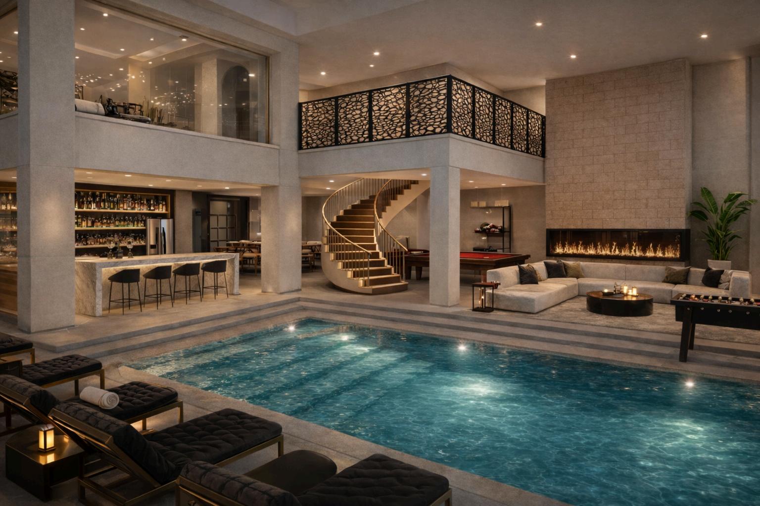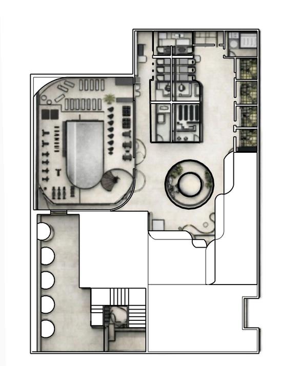 The extrovert house is designed as a socially engaging environment where spatial openness and programmatic elements work together to encourage interaction and activity. The plan incorporates a series of interconnected communal spaces, including a home theater, pool table area, and an expansive outdoor pool, all organized within an open-plan layout to ensure fluid movement and continuous connectivity. Large openings extend the living spaces outward, strengthening the relationship between indoor and outdoor zones. These features collectively create a dynamic and immersive setting that supports hosting, entertainment, and shared experiences, aligning with the extroverted lifestyle.