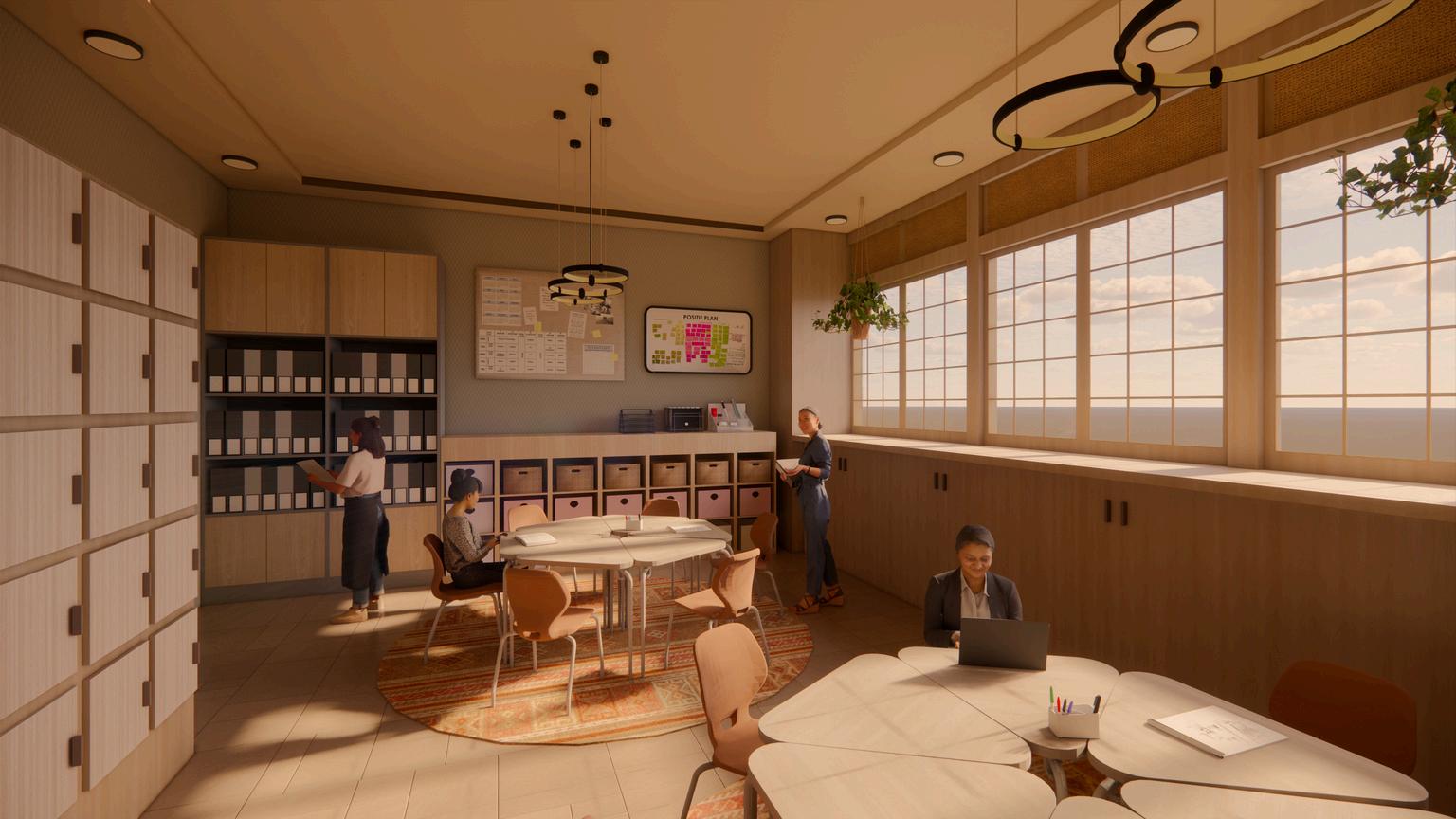 This design concept establishes a thoughtfully defined faculty zone that enhances both the professional and personal experience of educators. Positioned away from the noise and activity of the classroom environment, it supports focused work, collaborative engagement, and opportunities for restoration throughout the day. Designated areas for planning, combined with the integration of a kitchen and lounge, foster a sense of community and collegial connection among staff. Collectively, these elements create a balanced and supportive environment that promotes well-being, strengthens collaboration, and contributes to more effective teaching outcomes