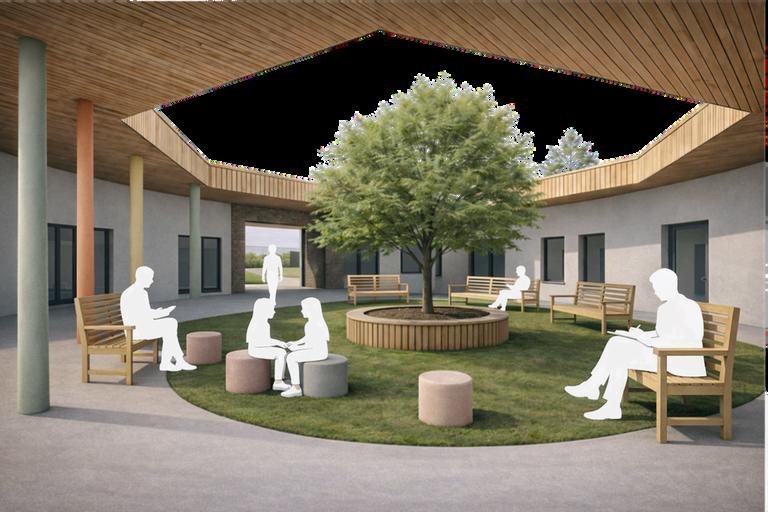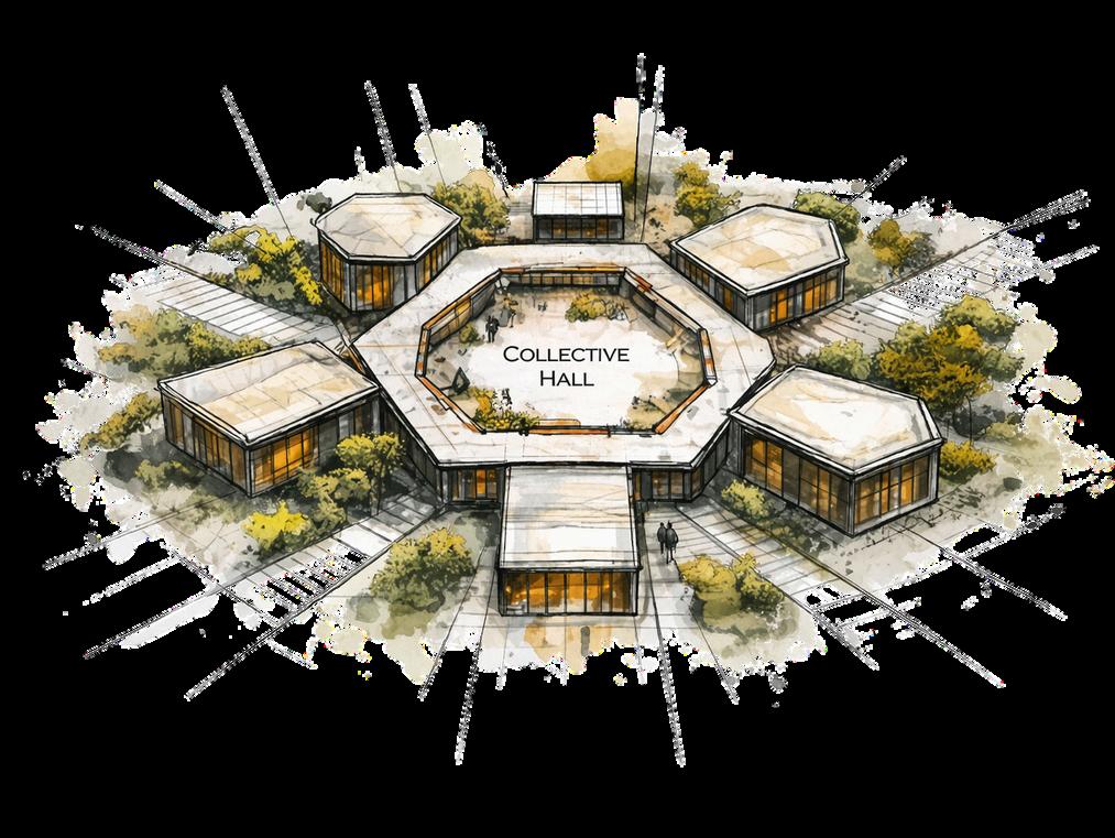 A modular campus organized around a central collective hall, using a hexagonal geometry to promote connectivity, visibility and community. This concept aims to distribute functions radially while maintaining a strong social core
