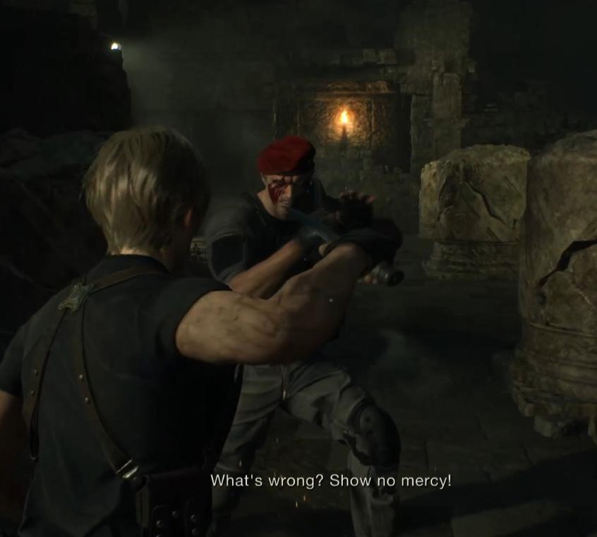 This can be utterly exhilarating. Resident Evil 4’s greatest fights are all here, bigger than ever, and feel better than ever to wade through. The core of combat remains location damage, shooting enemies in the legs or head in order to stagger them then following up with melee attacks—a brilliant push-pull dynamic that sees you staying on the edge of mobs until you need to dash in and unleash a roundhouse or suplex. A superb new addition is the ability to parry with your knife (though of course not all attacks can be parried), leading to these extended sequences of utter chaos where, through some combination of instinct and extreme firepower, Leon somehow walks away from an army with nary a scratch.