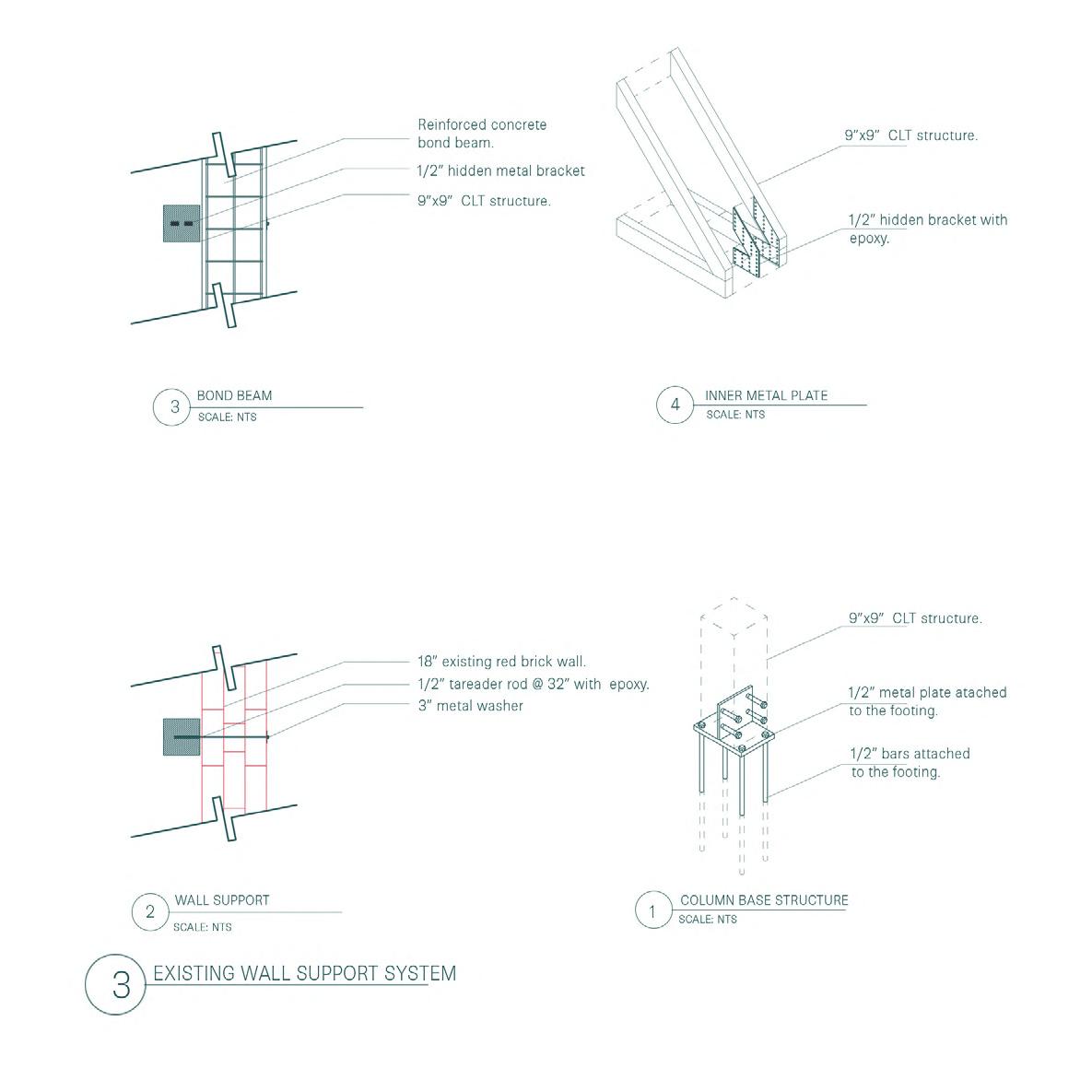 Through this project, we wanted to create a space to remember what happened, but a space able to create new memories. We started our design by focusing on the existing brick walls. The walls are weak on their own, resilient, and need support. We considered mass timber structural system for our building bones to create permanent support for the walls.