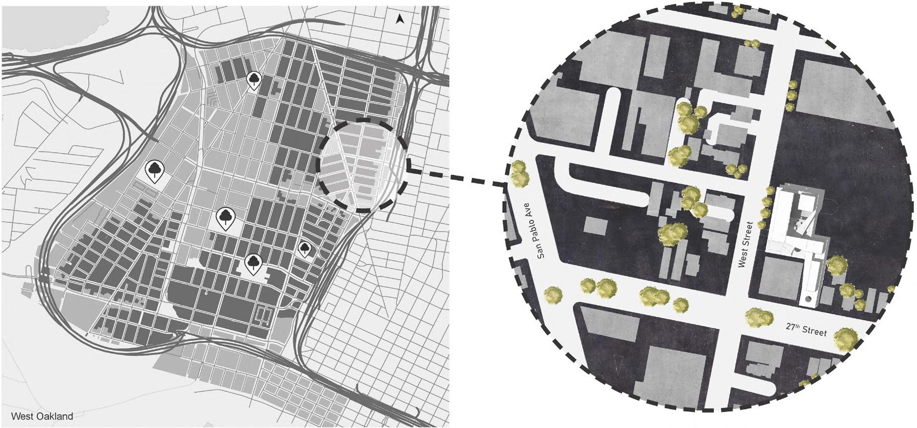 The Secret Garden is located in the Hoover/Foster neighborhood in West Oakland. This neighborhood is characterized by a lack of green spaces and parks. The proposal hybridizes the library with a park, a garden for reading, visiting, and simply enjoying as an integral part of the neighborhood. The main library circulation is transformed into a native plant garden, a mediator between the library and the city. This provides access to all, connects with nature and the surrounding urban fabric.
