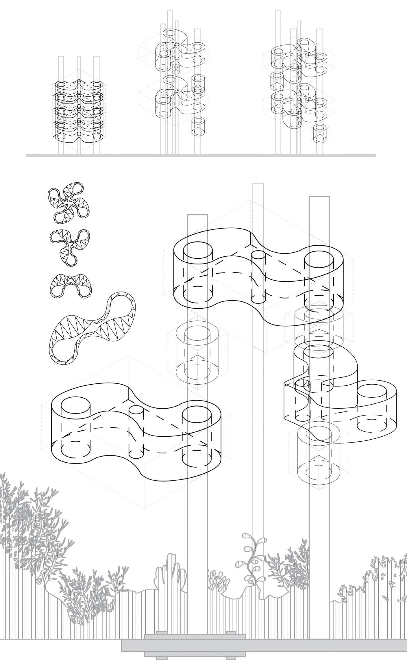 In macro scale, the rotatability of modules in relation to each other allows adjusting the overall form based on any infrastructure form that these modules would want to wrap. Wrapping underwater infrastructures not only turns their smooth, homogenous, and unlivable surfaces into porous, diverse, and liveable multi-faceted surfaces but also protects the infrastructure from scouring. For future works, SCWH can also act as a coral nursery because of the spatial qualities and underwater location that is appropriate for coral to grow. The coral nursery needs long-term research, inspection, and experimentation to determine its success rate but the infrastructure for doing that is ready.