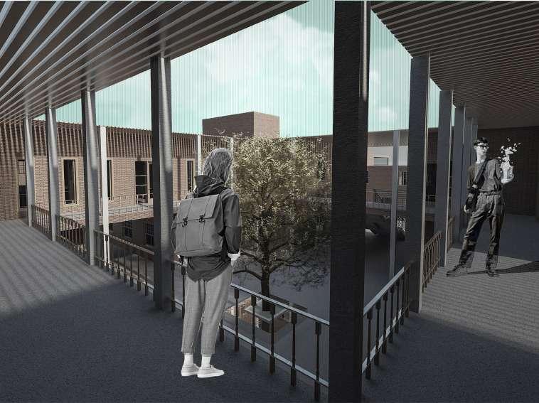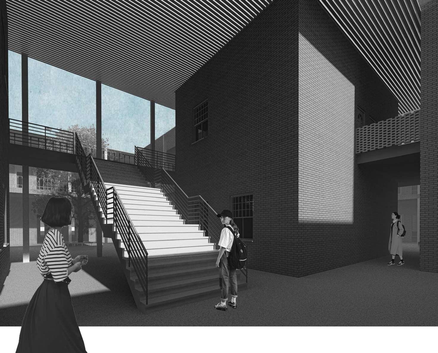 Bricks were used as the main materials throughout the architecture and become a medium to recall the lost materiality and texture of the place. Various kind of stacking patterns of bricks area used on the facade in order to generate translucency, which breaks the solidity and heaviness of brick wall, allows different light and shadow effects and promote the sense of publicness.