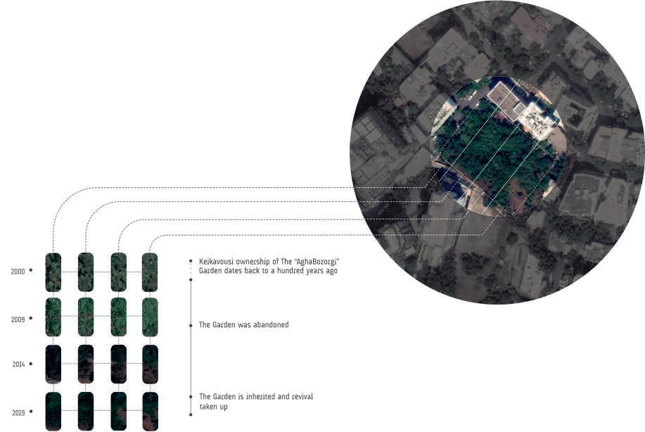 The Project was based on the observation of AghaBozorgi garden with the aim of preserving it as a natural heritage site of Shemiran. In this project we observed the relations of the space of the garden with the dense neighboring city fabric, and the space with direct dialog with its vegetation and creatures. Sensors of soil and water humidity, temperature, carbon monoxide and location produce meaningful data that can be interpreted as a documentation of this garden. Different layers of data and graphs are combined together to create a bio mesh as living archive of the garden. s