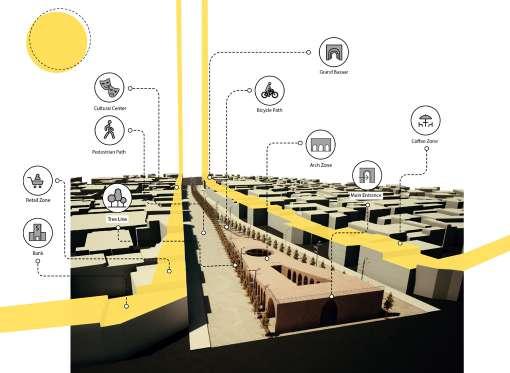 Thus, by the gradual advancement in plan and variation of the height and symmetry of the adjacent arches, according to the texture of the area and the structure, we were referring to the main entrance of the Bazaar.