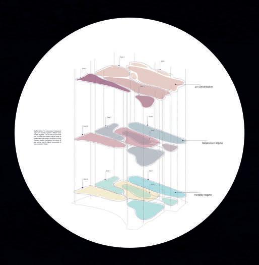 Each zone indicates the average humidity of the garden divided into five different layers. Areas which are in the vicinity of the buildings have higher humidity average because the buildings prevent water vapors from evaporation. This factor has a main impact on the creation of the microclimate inside of the garden. S