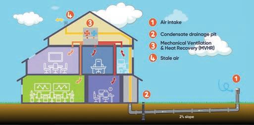 Principle: The Mechanical Ventilation & Heat Recovery (MVHR) operates year-round. It consists of an extraction and supply system equipped with a heat exchanger. The Earth-Air Heat Exchanger (EAHX) seamlessly connects to the system’s fresh air intake. In cold periods, stale (warm) air is extracted from the building and transfers its heat to the incoming (cold) air through the heat exchanger. In warm periods, the heat exchanger is bypassed or deactivated, and a higher airflow rate is often distributed by the AHU. In this case, the Earth-Air Heat Exchanger helps cool ventilated areas. Optimizing airflow to meet the building’s needs is key to system performance. Since heat exchangers have varying efficiency levels, it is recommended to pair an EAHX with a low-efficiency heat exchanger to avoid oversizing the system.