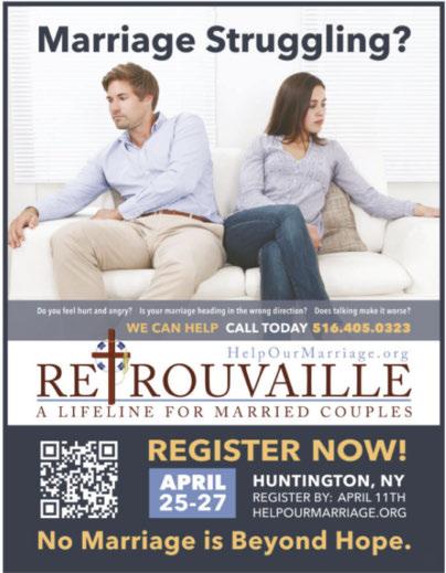 Worldwide Marriage Encounter sponsors a variety of in-person and virtual marriage experiences, some on weekends and some on seven weekdays. Couples explore their relationship with each other, God, and the Church. Registration is limited; there is a $100 application fee. For more information or to apply, call Kevin & Regina Hickson at 516-554-3835 or https://wwmenyli.org/.