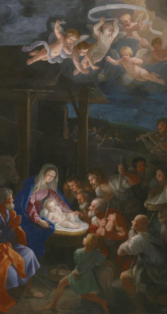 Te painting shows the scene of the shepherds paying homage to baby Jesus shortly after his birth. At the center, the Christ Child glows with a soft, heavenly light, lighting up the faces of Mary, Joseph, and the shepherds around him. Murillo uses light and shadow (a technique called chiaroscuro) to make the scene feel full of depth and emotion. Tis style pulls the viewer into a peaceful and loving moment.