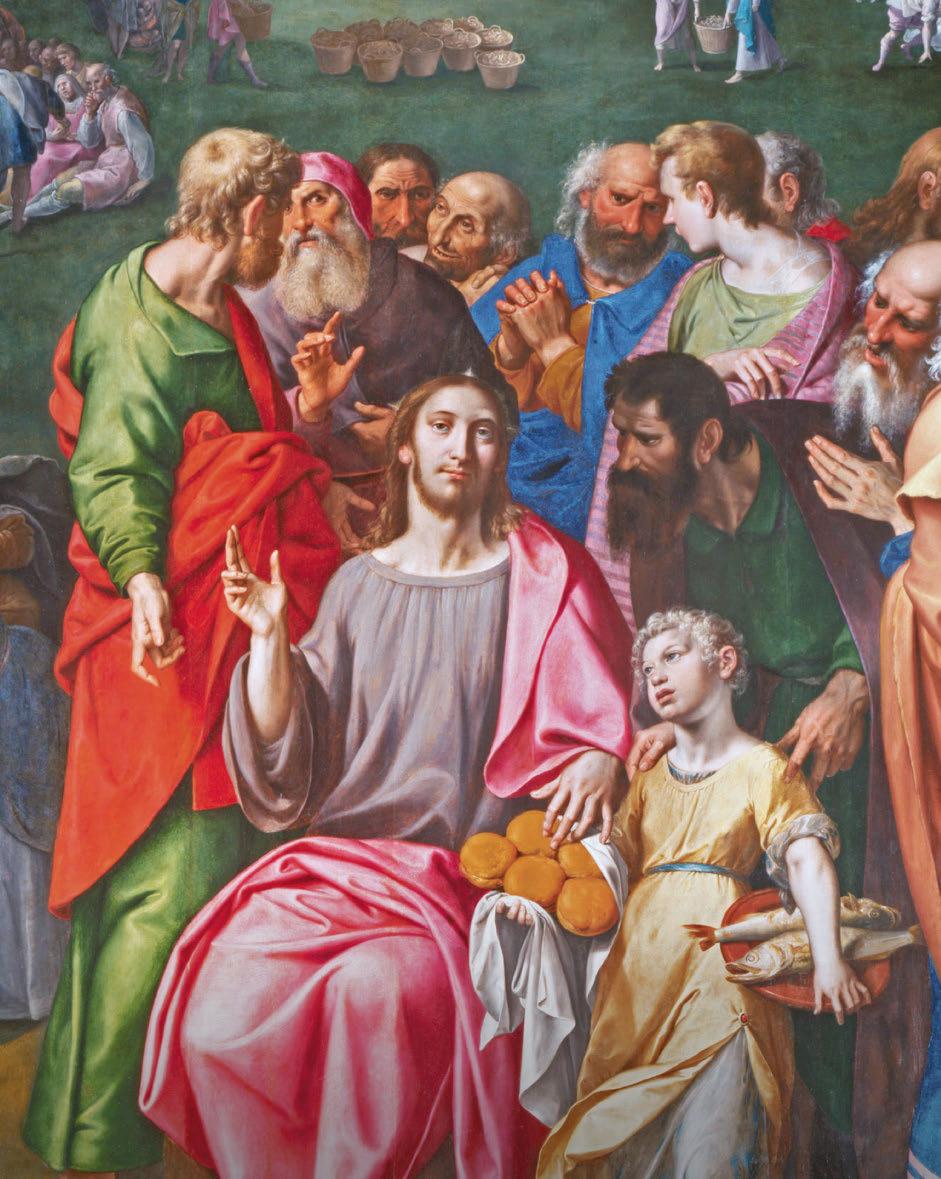 Te leftover twelve baskets of bread, one for each of the Apostles, further symbolize the Eucharist’s connection to the Last Supper.