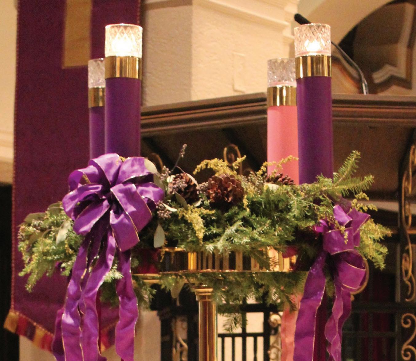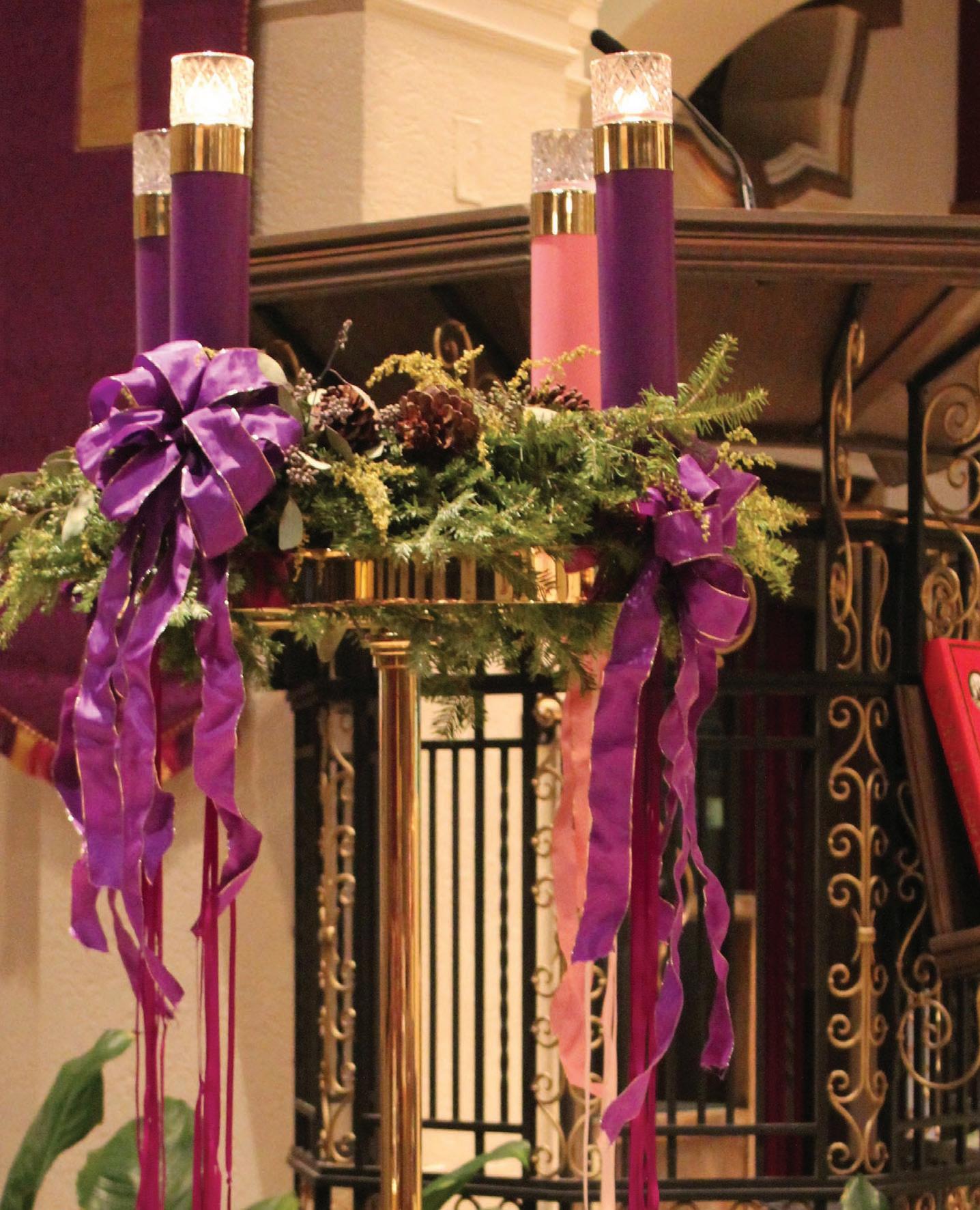 Many families display an Advent Wreath in their homes, and before dinner say prayers of blessing before lighting the candle. The Advent Wreath is the main symbol of the season. You will notice that the wreath has four candles, representing the four weeks of Advent. Each week we light a candle to remind us that the time of salvation draws near. Three of the candles are purple: the first, second and fourth weeks. Purple is the color of waiting, conversion, and hope. The third week is Gaudete (or Rejoice) Sunday when we light a pink or rose-colored candle. It is in the third week that we first hear in the Scriptures of the coming of the Messiah. The Entrance Chant or Antiphon calls us to “Rejoice in the Lord always; again I say, rejoice.” The color of joy is white and when that is mixed with purple it creates pink. But even in that joy of hearing of the Messiah, we are reminded to continue to focus on our preparations and hence the fourth week is again a purple candle.