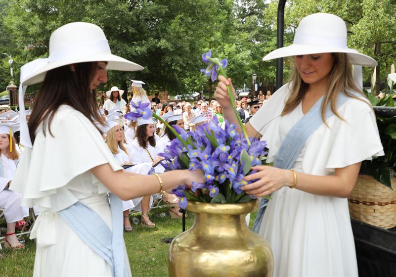 Commencement for the 180th session was held in the Grove, May 22, 2022. Marshal Chelsea Coleman ’23 leads the procession. Marshals collect the commencement irises in the Class of ‘87HS brass urn. Commencement speaker Susan LaSalla, center, with nieces Mary Susan Rideout ’24, left, and Dimney Rideout ’22, right.