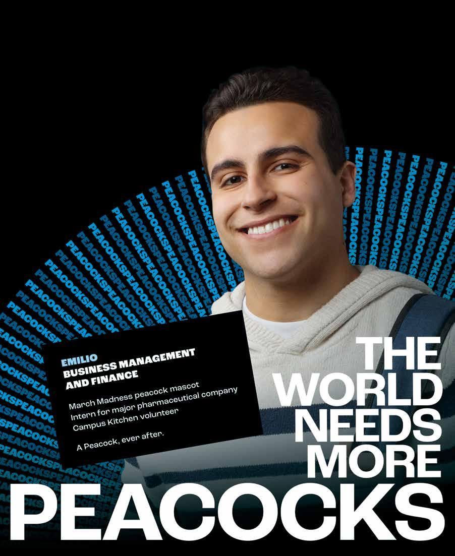 The energy, vitality and cura personalis that distinguishes Saint Peter’s University from other higher education institutions is encapsulated in a bold brand campaign, The World Needs More Peacocks. Capitalizing on the momentum generated following the men’s basketball team’s inspiring run to the Elite Eight 2022 NCAA Tournament, the campaign taps into the University’s core strengths such as the character and diversity of students, the breadth and depth of opportunities, Jersey City location and spiritfilled community. The brand campaign is multifaceted. It launched in early 2023 in a range of print, digital and transit media. The refreshed brand message and look is the result of a six-month effort led by a steering committee with input from numerous constituencies. Saint Peter’s worked with Lipman Hearne, a Chicago-based marketing and communications firm focused on the nonprofit sector, to bring the new brand to life.