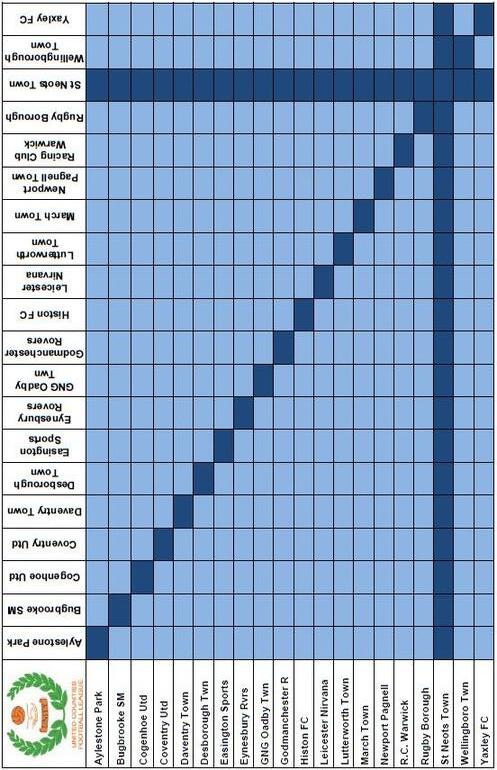 After an absence of twelve seasons, it is back for our first match in the United Counties Football League.In that time the league has changed, expanded, and moved geographically further north and now has two Premier Divisions – one north and one south. We are to play in the south division and a quick look at its composition reveals that only five clubs are the same as we faced in the 2010/11 season. They are Cogenhoe, Desborough, Newport Pagnell, Wellingborough, and Yaxley. In addition to that quintet of clubs we have also played Bugbrooke, Daventry Town, and Eynesbury in UCL competition, which means that eleven of our league opponents will be new to us, although we have played two further UCL clubs –Godmanchester Rovers and Leicester Nirvana (the latter under the name of Thurnby Nirvana) in cup competitions.