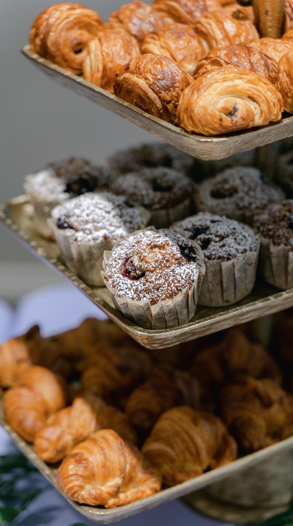 House Baked Butter Croissants, Assorted Miniature Muffins & Danishes, Sweet Butter & Fruit Preserves, Chilled Orange & Cranberry Juices, Freshly Brewed Lavazza Regular Coffee, Decaffeinated Coffee & Organic Teas, Selection of Whole, 2% & Skim Milk