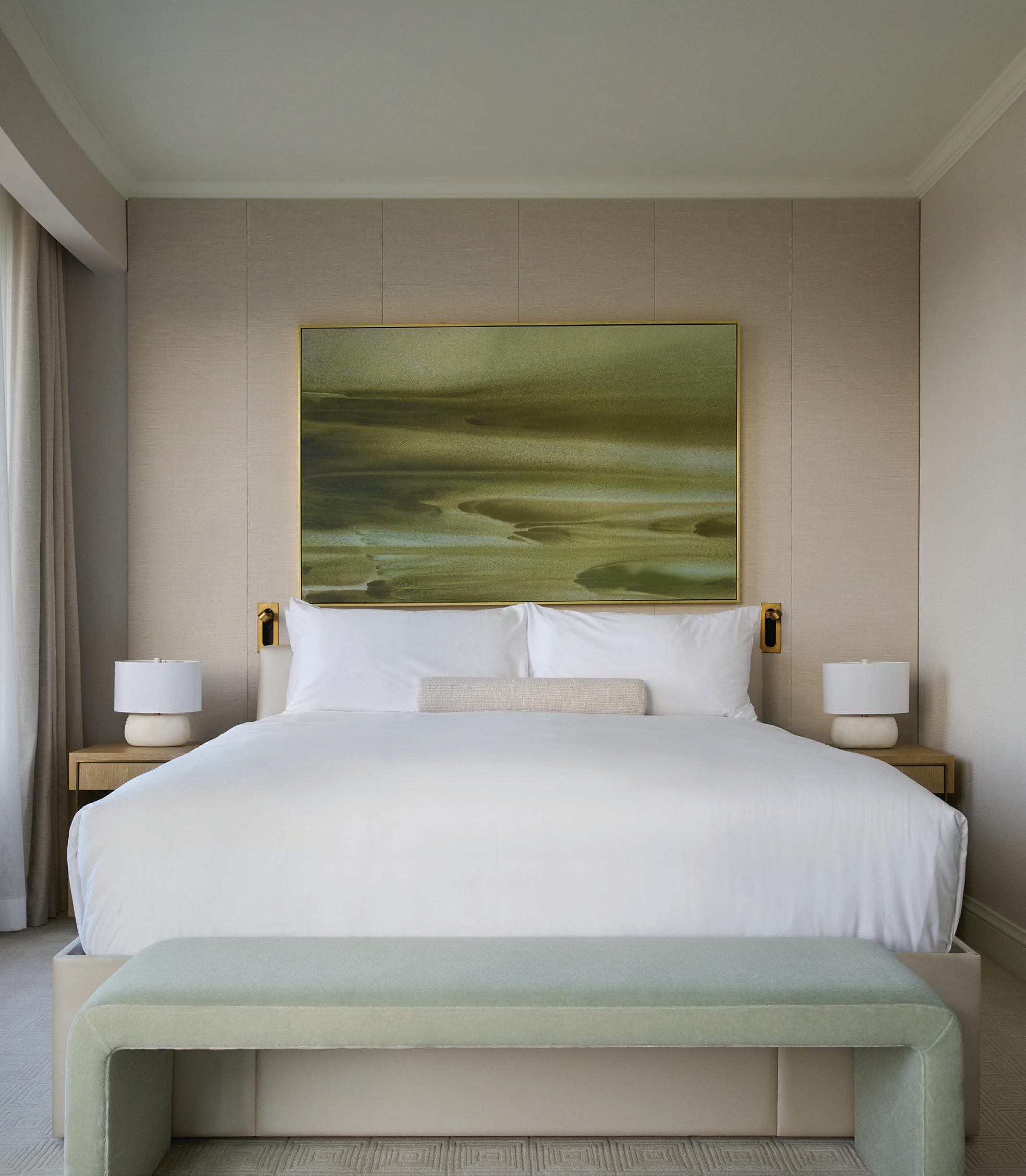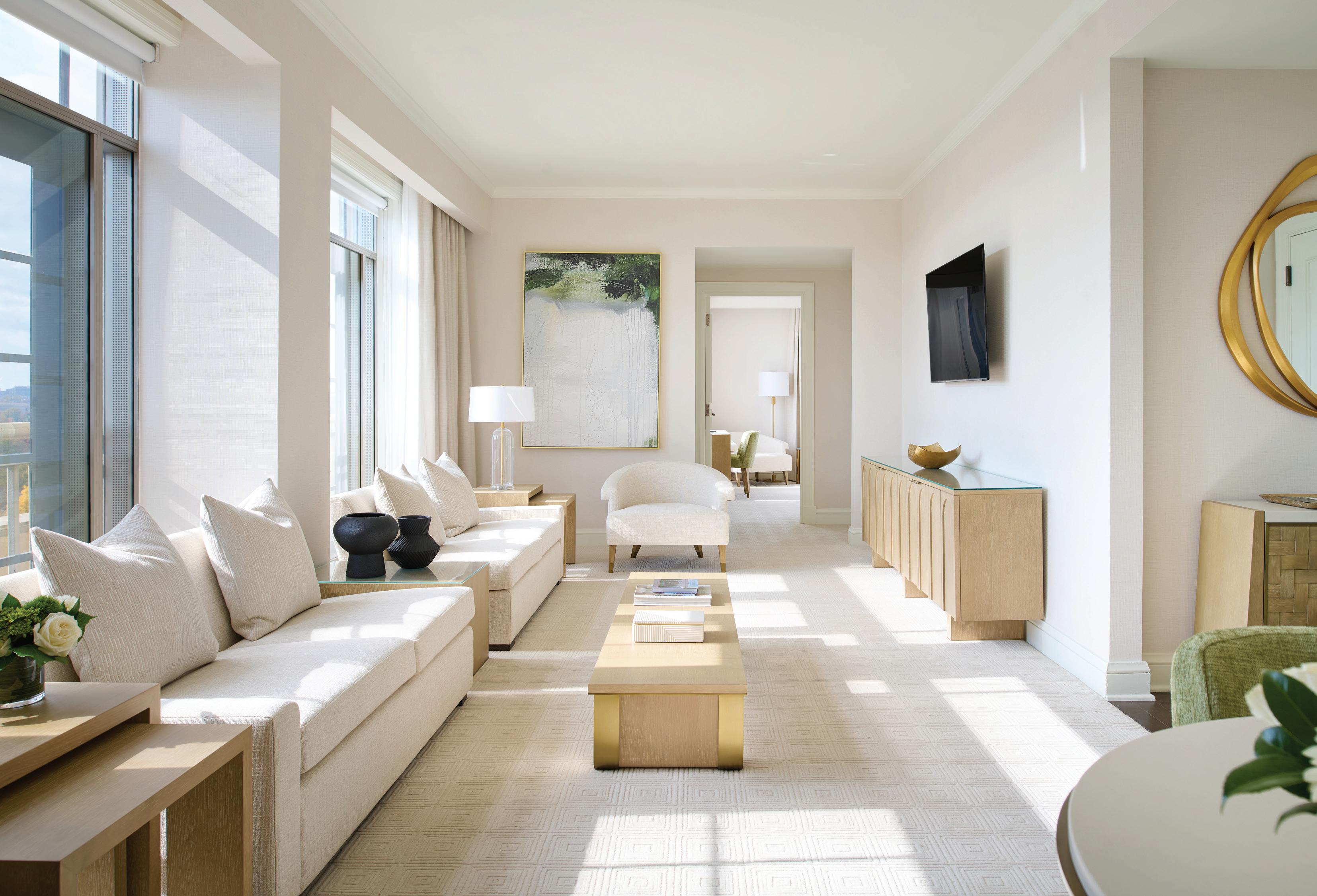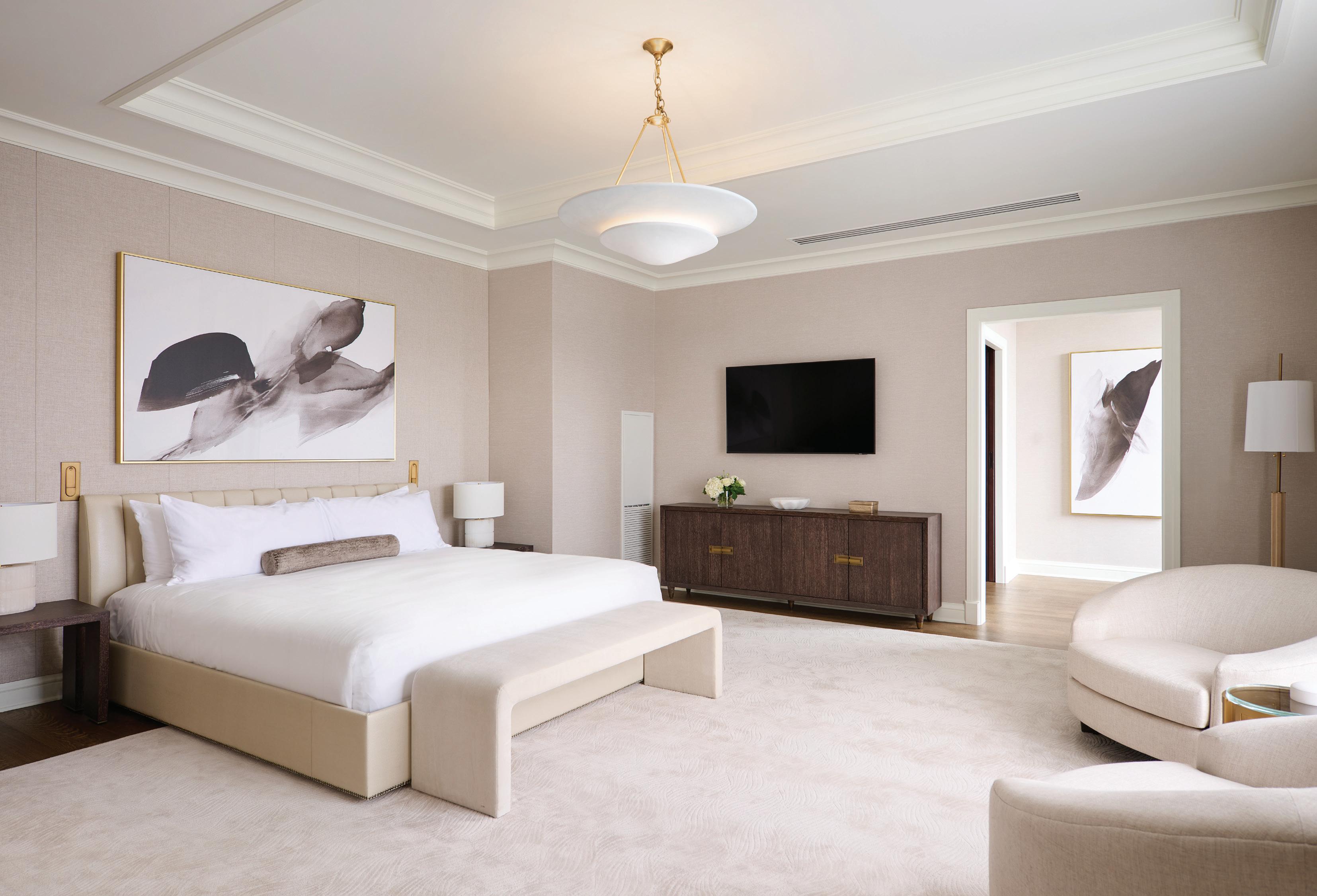 Other highlights include a dedicated office, an intimate media room, a fully equipped kitchen, and a thoughtfully appointed butler’s pantry. For those desiring additional accommodations, an adjoining king bedroom expands the suite into an exquisite three-bedroom residence.