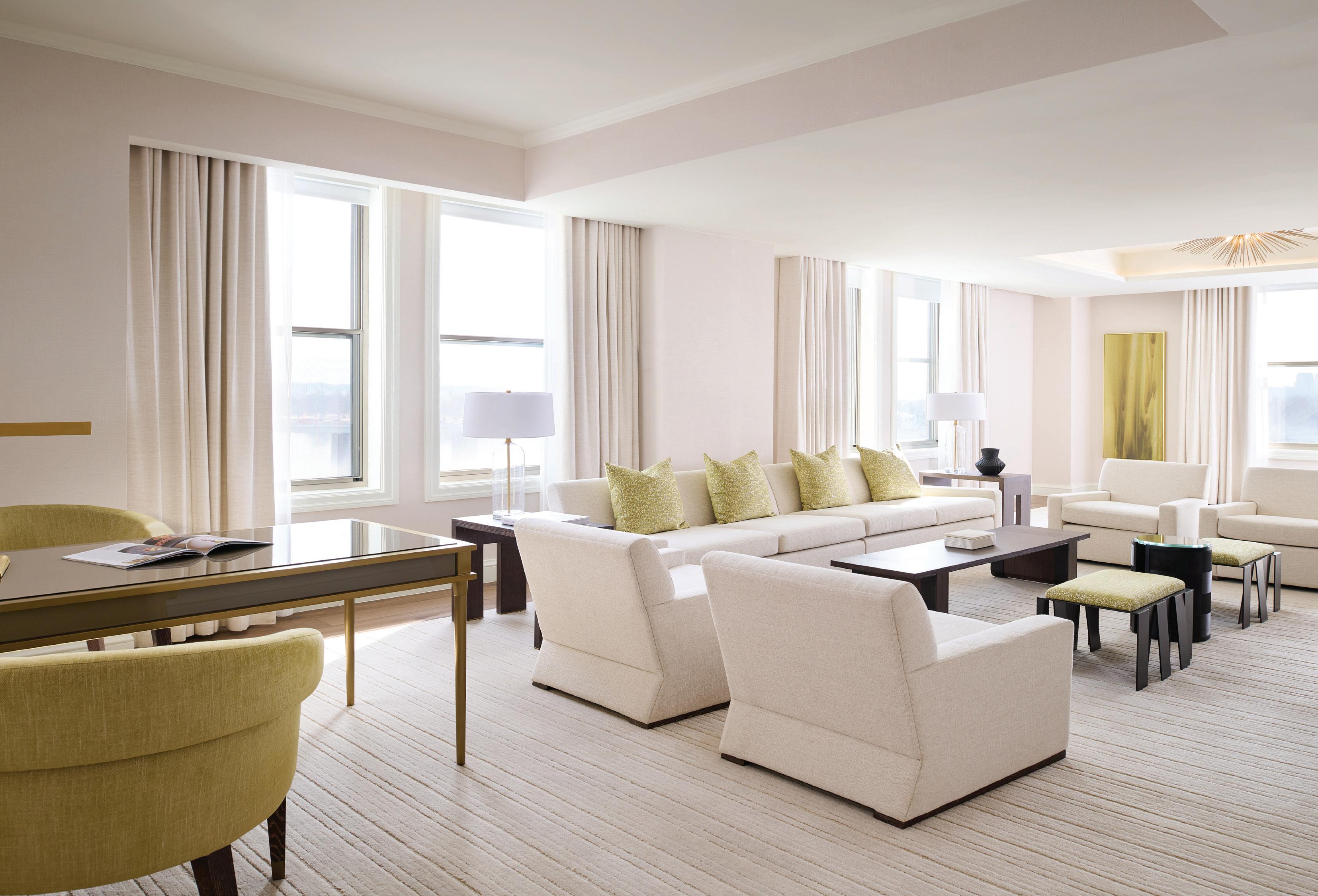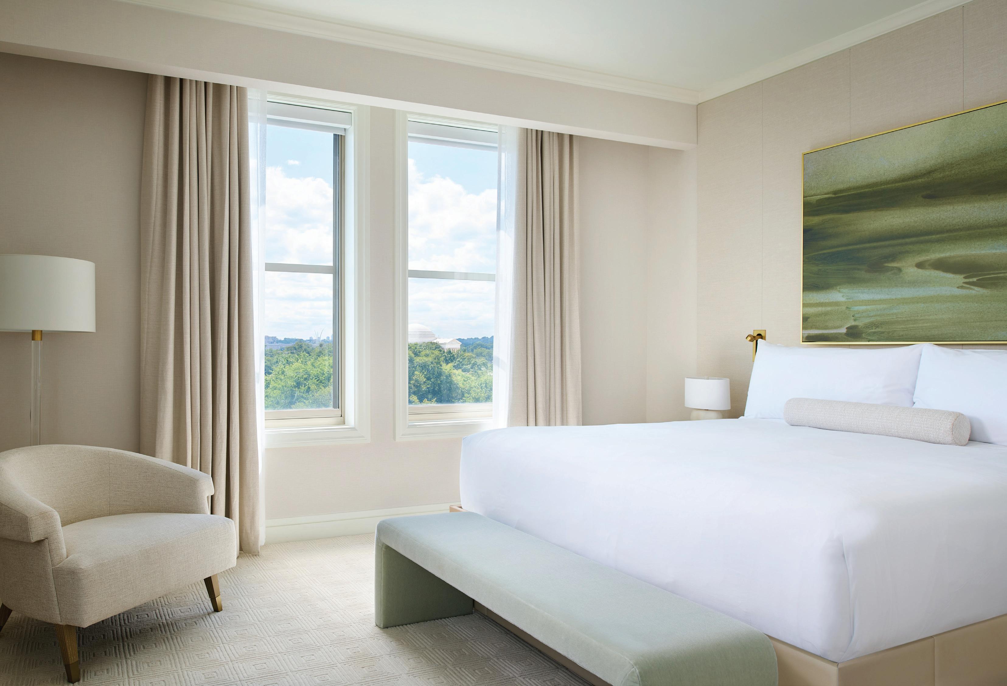 Spanning over 3,000 sq. ft., this signature suite includes two bedrooms — one with a king bed, the second with two queen beds — along with two and a half bathrooms. The expansive living room features 20-foot ceilings and breathtaking views of the Tidal Basin and Jefferson Memorial, while the dining room’s eight-guest table is complemented by a separate entrance for seamless service.