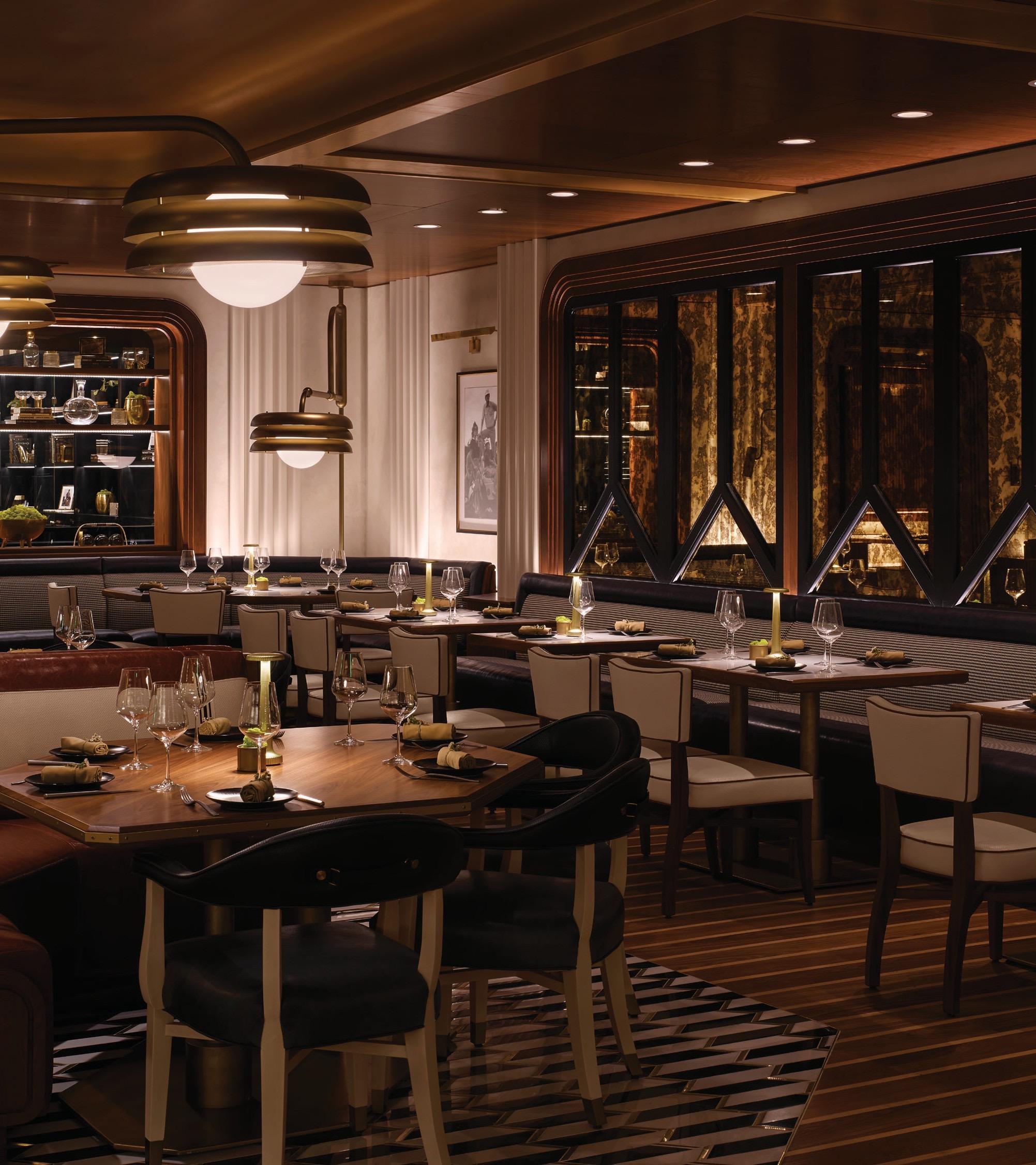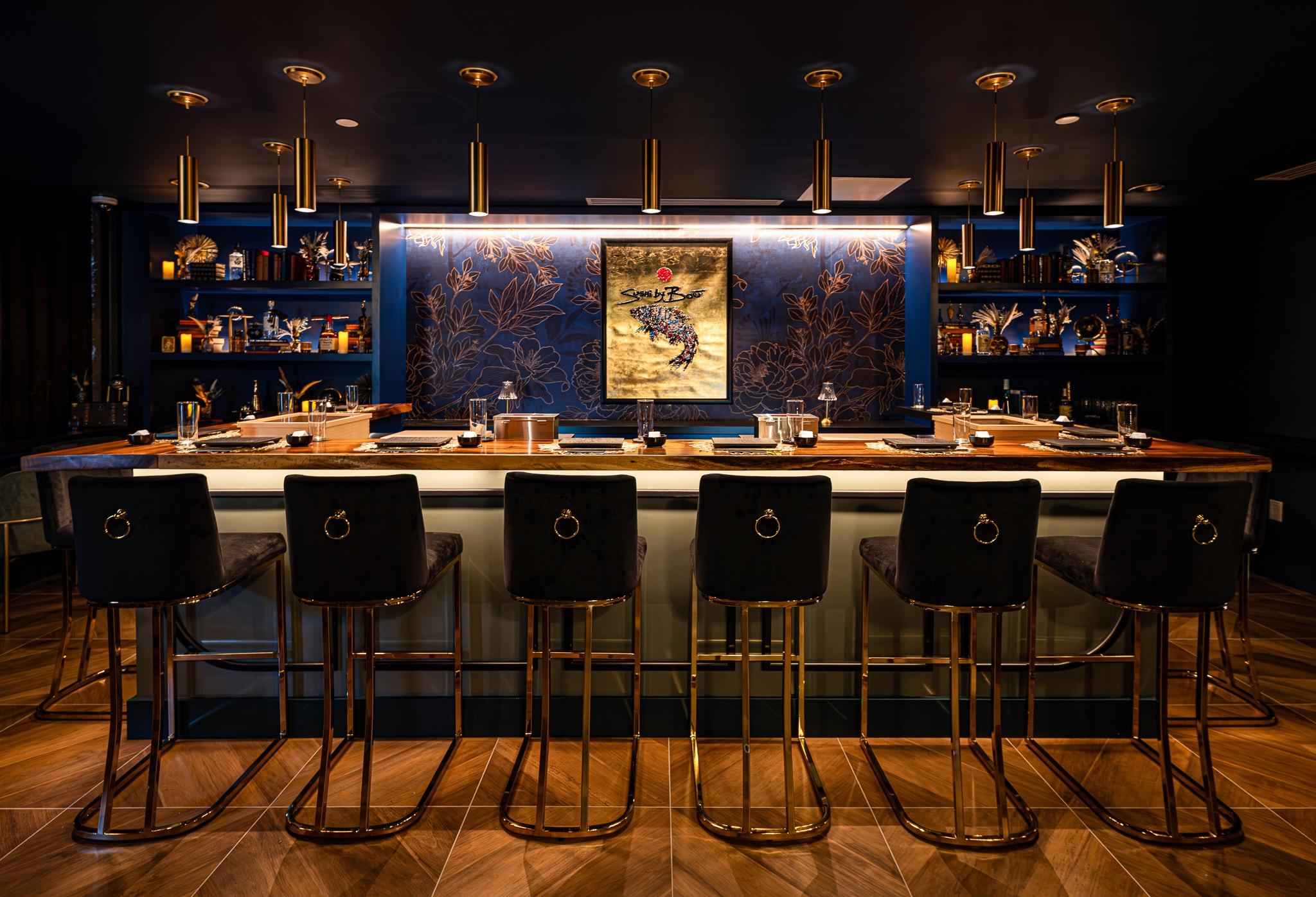 Sushi by Bou exudes 1920s speakeasy opulence from the moment guests walk through the door. The ambiance is heightened with layers of rich color palettes, while patterned wallpaper, fringed lamps, feathered pampas, and crystal chandeliers create a luxuriously layered experience. The cocktail bar features a lush green banquette, a richly paneled bar, and a captivating back bar display. The Sushi Omakase, or chef's choice, guides guests through the hourlong sensorial experience. Guests can sit back and let the chef decide their menu and unique libations.