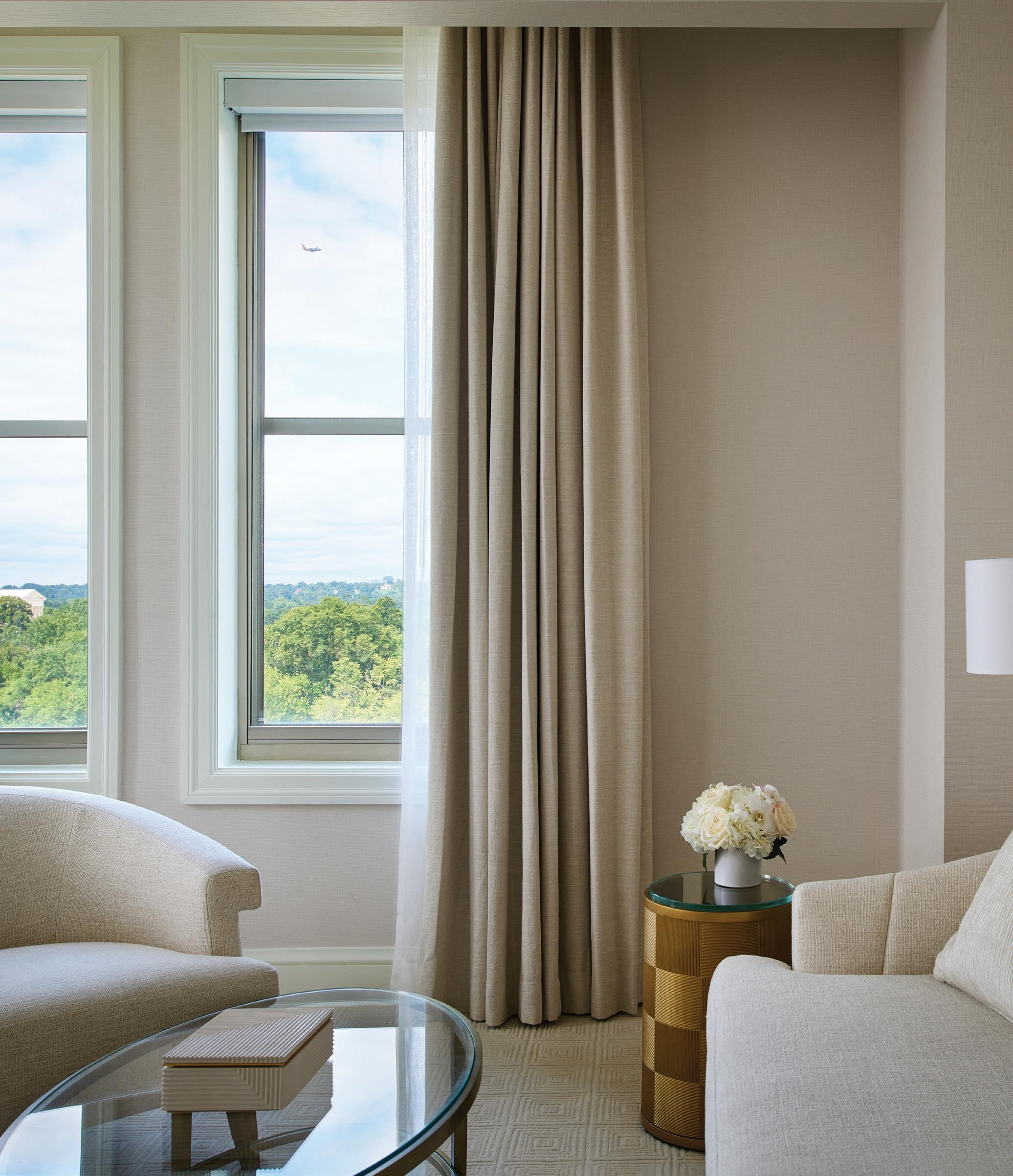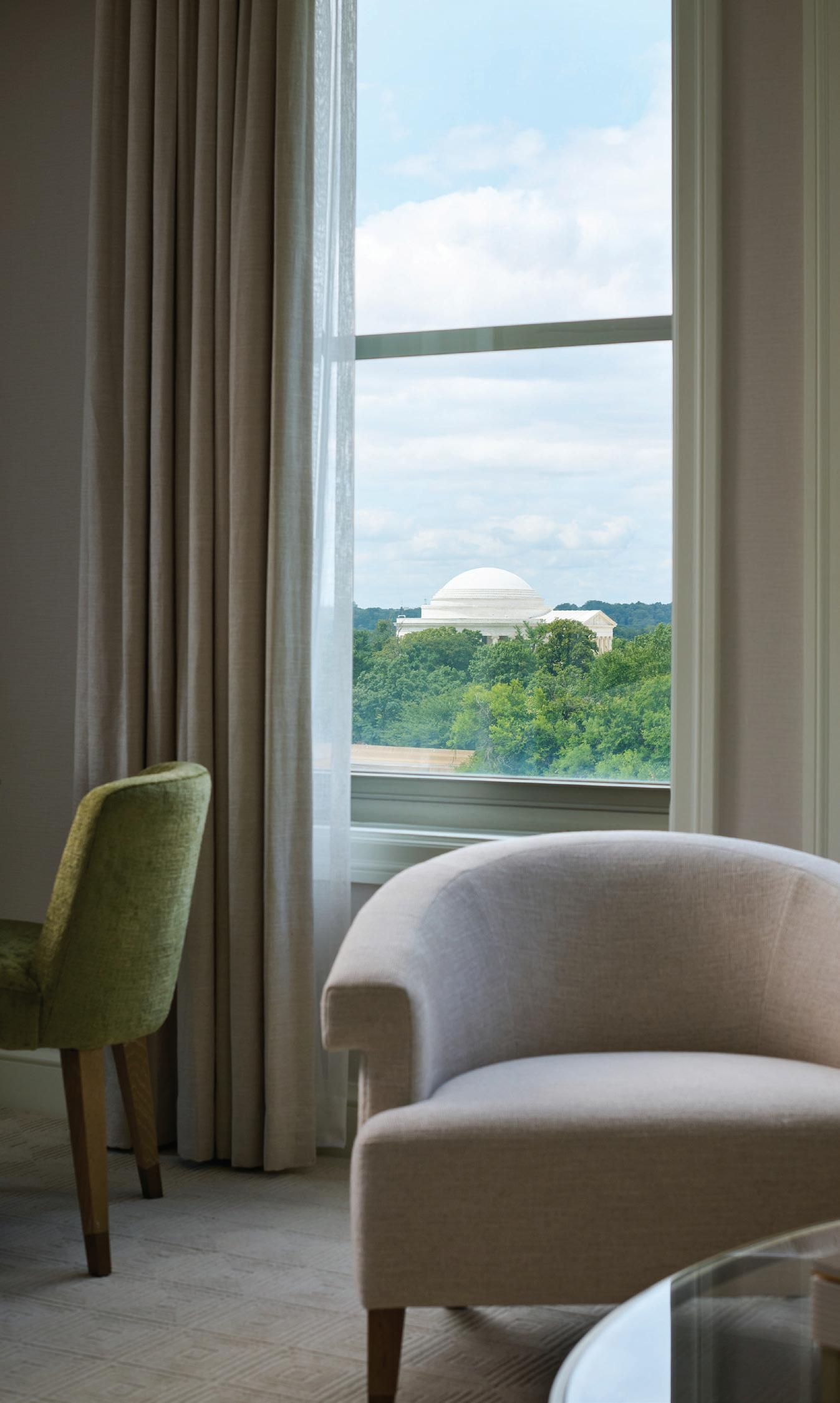 Spanning over 3,000 sq. ft., this signature suite includes two bedrooms — one with a king bed, the second with two queen beds — along with two and a half bathrooms. The expansive living room features 20-foot ceilings and breathtaking views of the Tidal Basin and Jefferson Memorial, while the dining room’s eight-guest table is complemented by a separate entrance for seamless service.
