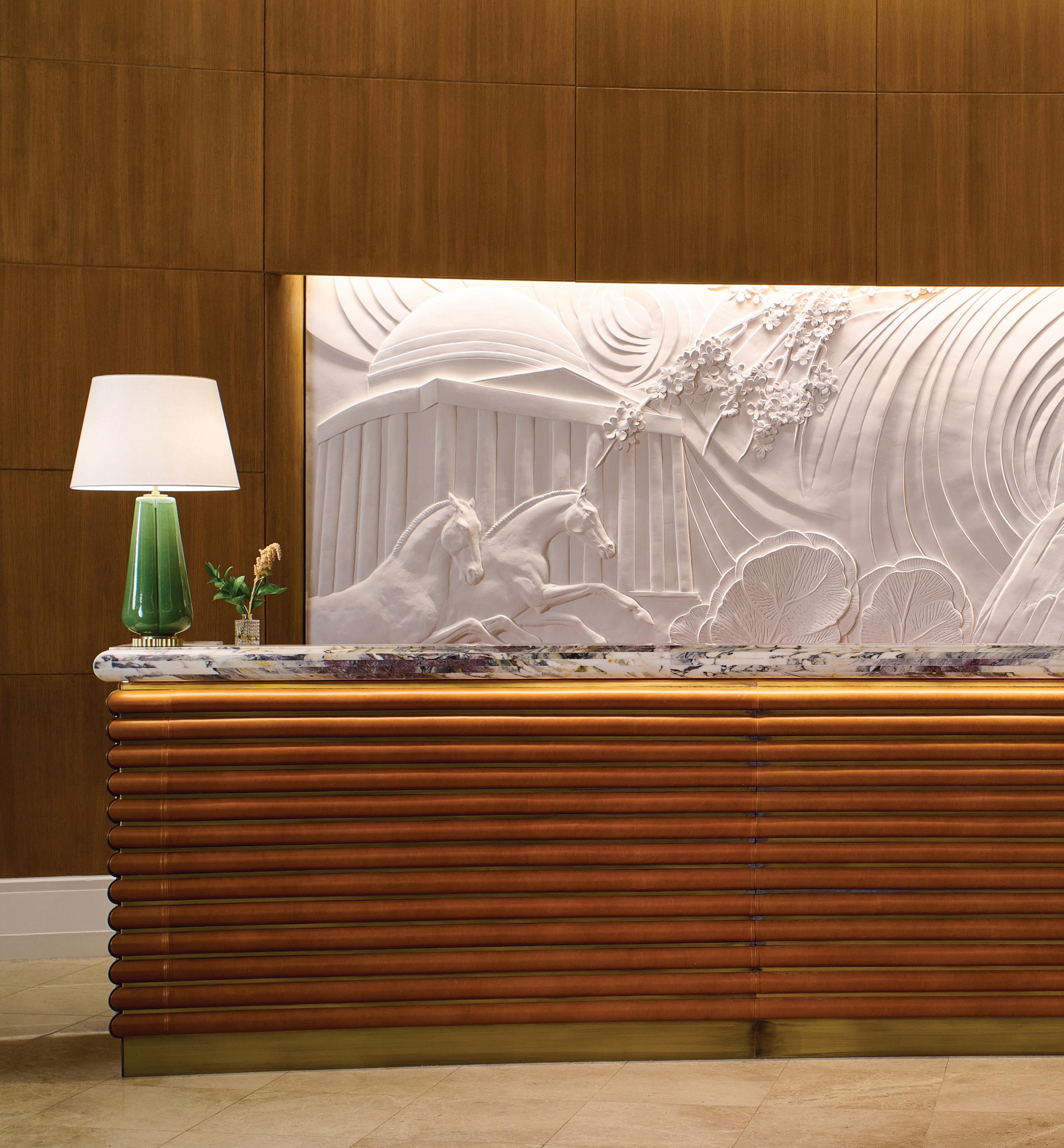 The stunning bas-relief artwork that greets guests at Salamander Washington DC’s front desk is the creation of renowned plaster artist Michael Glickman.