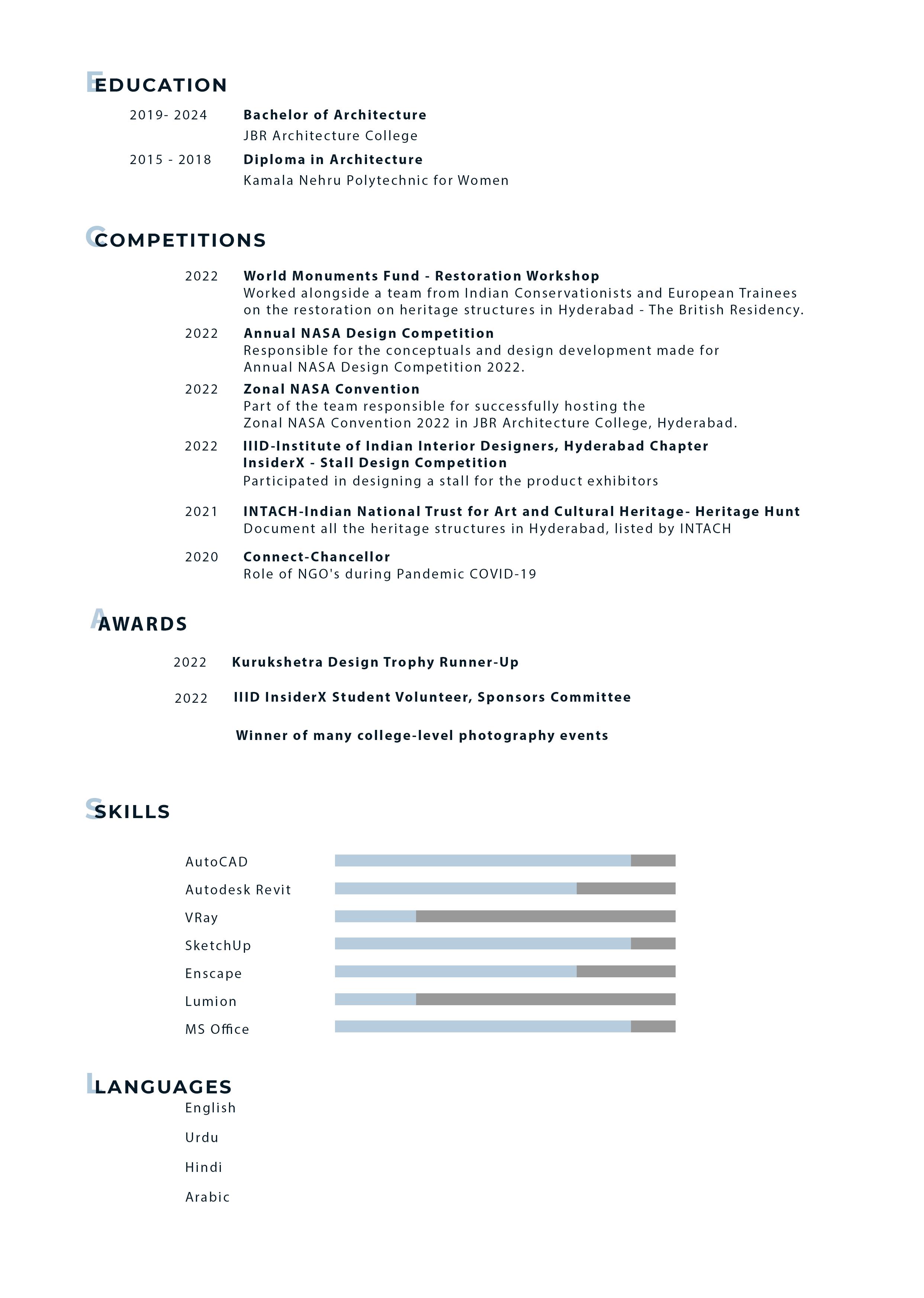 Saleha Fatima's portfolio is not just a collection of blueprints and sketches; it's a glimpse into the soul of an architect with a passion for shaping spaces that resonate with life and purpose. Her journey began in the streets, corners, and stories of everyday life, where elements like sun-drenched courtyards and ancient temple carvings whispered tales of function, form, and the unspoken language of spaces that touch the human spirit. The portfolio showcases a diverse range of projects, from intimate family havens to vibrant community structures, reflecting Saleha's belief that architecture is about crafting experiences and leaving an indelible mark. Despite facing challenges, Saleha's approach combines technical precision and boundless creativity. The portfolio serves as a compass for her architectural odyssey, inviting others to join her in exploring the possibilities within every line drawn and every brick laid. It's a call to build not just structures but dreams, and an invitation to connect.