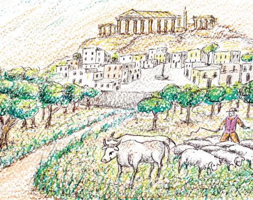 Infine, nel pianoro sottostante, fuori dalle mura che difendevano l’agglomerato urbano e il tempio, si stendeva la chora, ampia distesa di terra in cui, all’alba, si riversavano contadini, pastori e operai che ritornavano nell’ ástu / ásturon al tramonto prima che le porte delle mura di cinta si chiudessero per la notte.