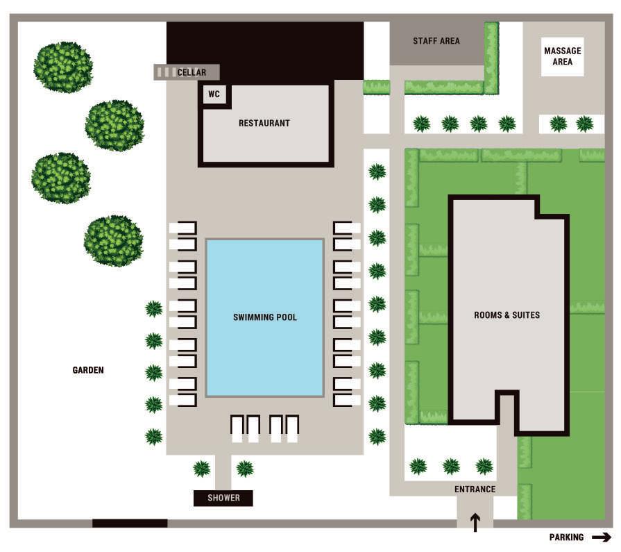 They are all different and have a wine bar, queen-size bed, soft lounge zone, garden, terrace or balcony with or without a view of the pool or garden. Some suites have cozy in-room fireplaces, freestanding bathtubs, or jacuzzi. Enjoy them.