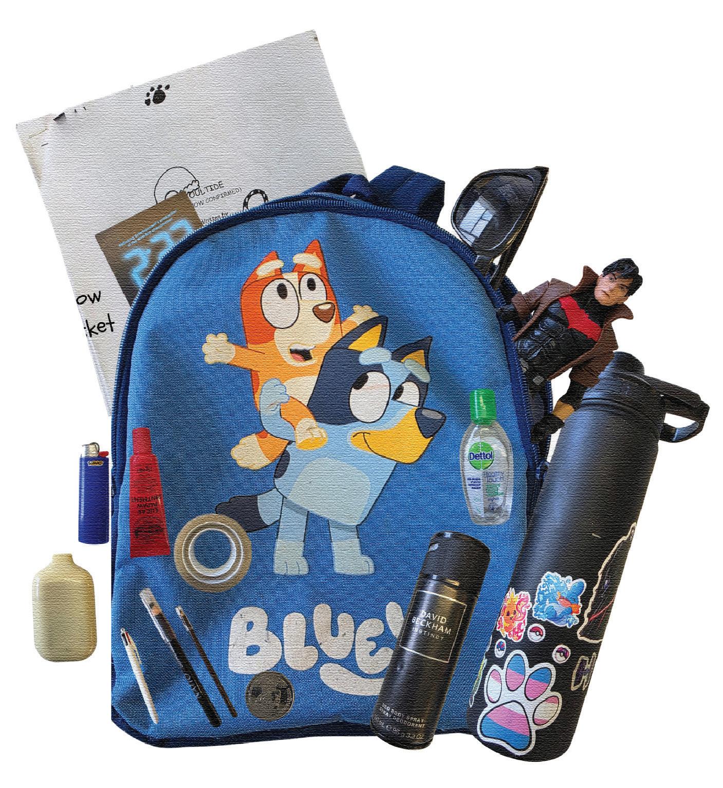 As a theatre postgrad, I tend to only bring with me the most essential of items on my day-to-day at campus: water bottle, lip balm, deodorant and, of course, an action figure of whatever comfort character picks my fancy that morning as i pack my bag. in a post-CoVid world, especially working in such a networking based one, hand sanitiser is also always on my person, because I never know how many hands I’ll be shaking or dusty old lights I’ll be touching. I’ve got two different kinds of eyeliner. I don’t have an explanation for that, I just wear a lot of it. Sunglasses, tape and a pen are necessities I believe everybody should have in their backpack for any reason, because they’re literally always useful.