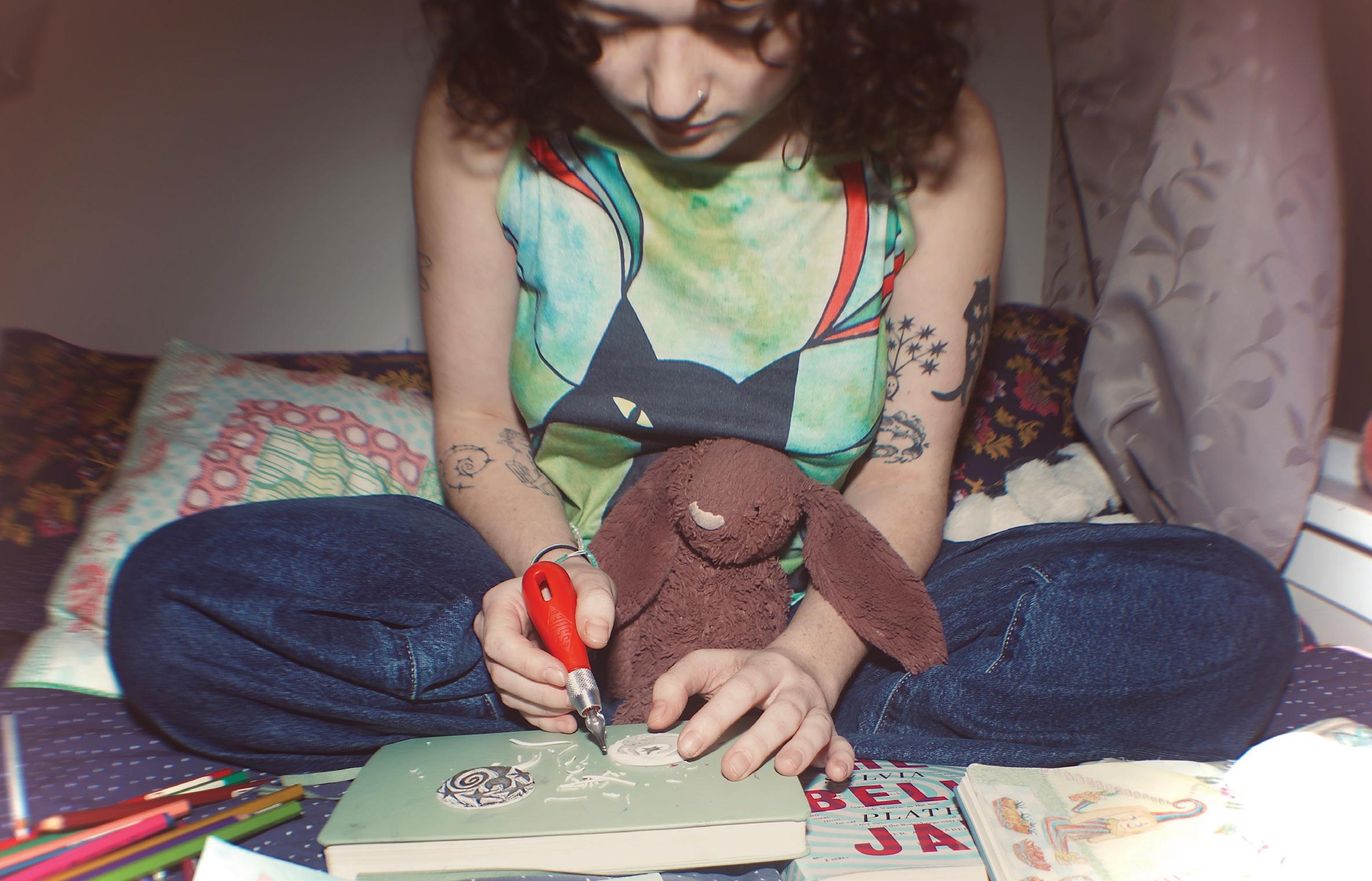 I’m a queer, trans, and intersex multimedia artist. A lot of my work is deeply tied to my experiences with depression and the ways I use art to process emotions and make sense of myself and the world. Creating gives me a space for expression when words feel out of reach. Right now, I’m also fundraising for top surgery. If you’d like to support me, please scan the QR code to donate.