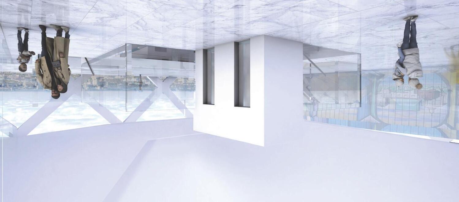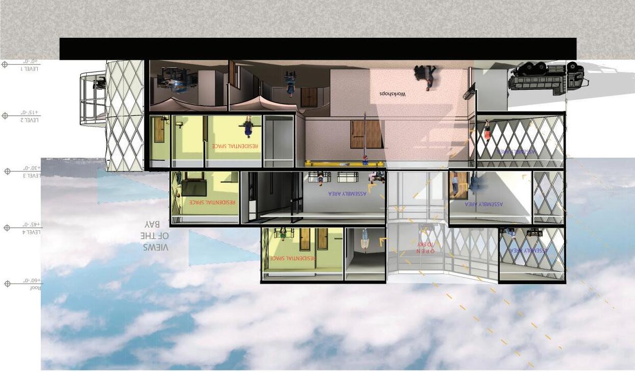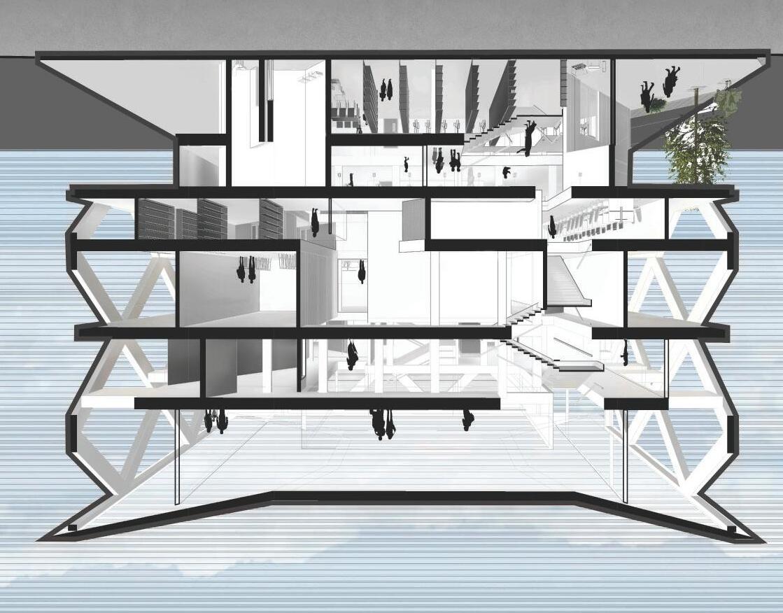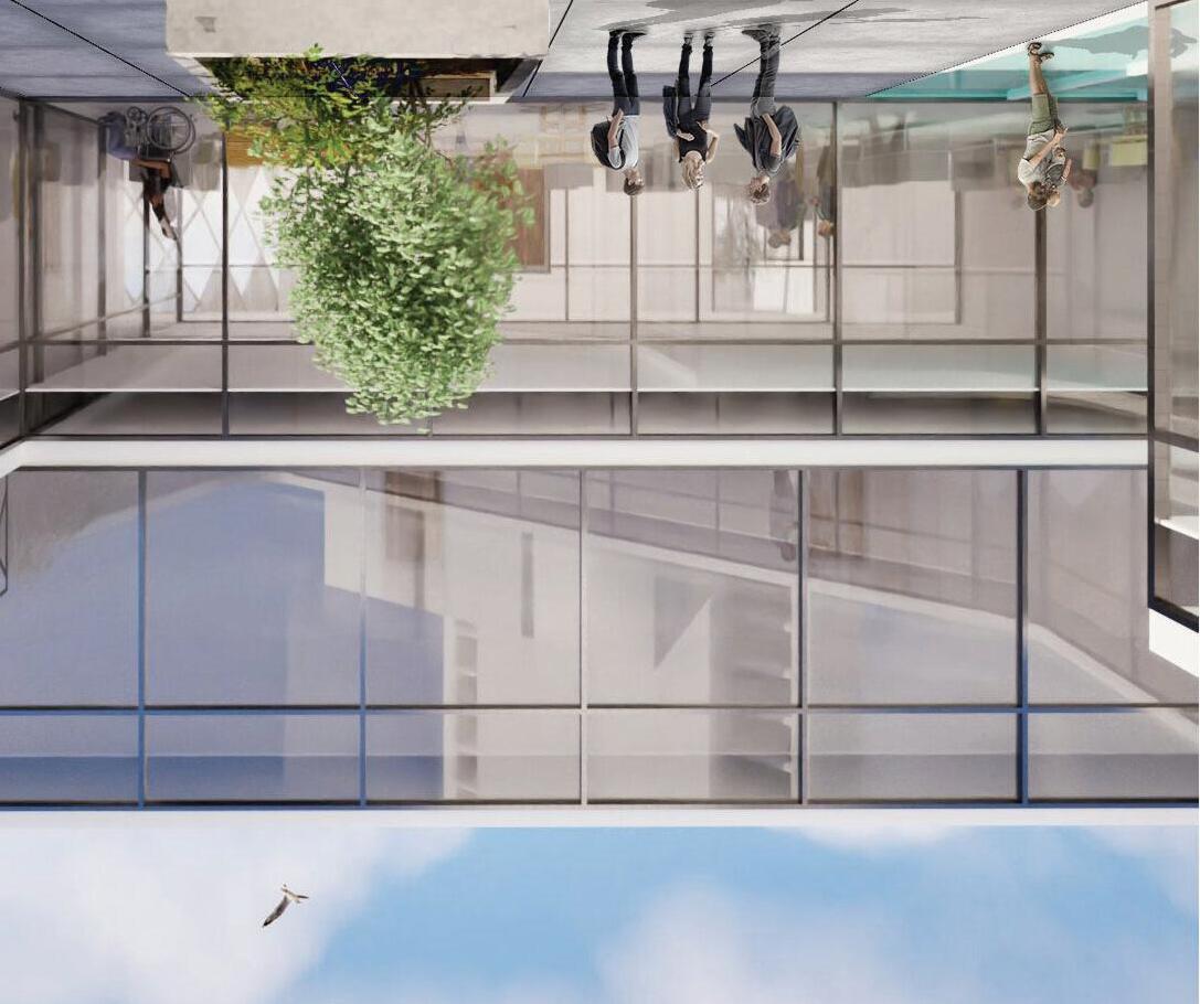 Urban Frame responds to Oakland’s context with an interactive design that evolves into a panoramic topfloor platform. Zoning supports diverse users: adults engage with community outreach on the first floor, children enjoy a playful cozy second floor with a café for the parents, and teens have a third-floor lounge. Upper levels house staff functions. A translucent roof and strategic glazing enhance daylight and city views.
