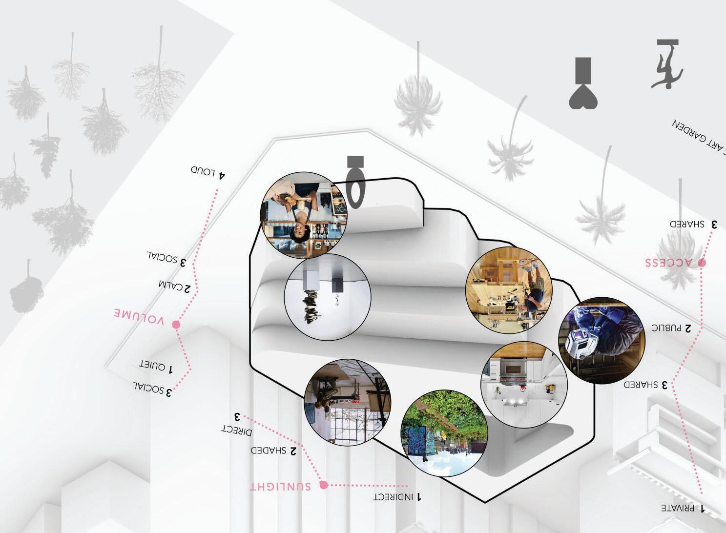 The Forge responds to Treasure Island’s wind, sun, and documented soil radiation. Site analysis led to robust, elevated construction for occupant health. The massing is raised and rotated for ventilation and solar orientation, eroded for access, illuminated for daylight, shifted to define public and private zones, and terraced to create outdoor spaces. Each transformation, diagrammed above, directly addresses a site condition.
