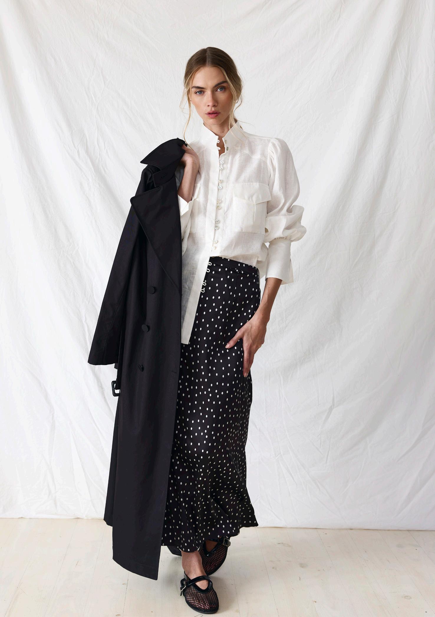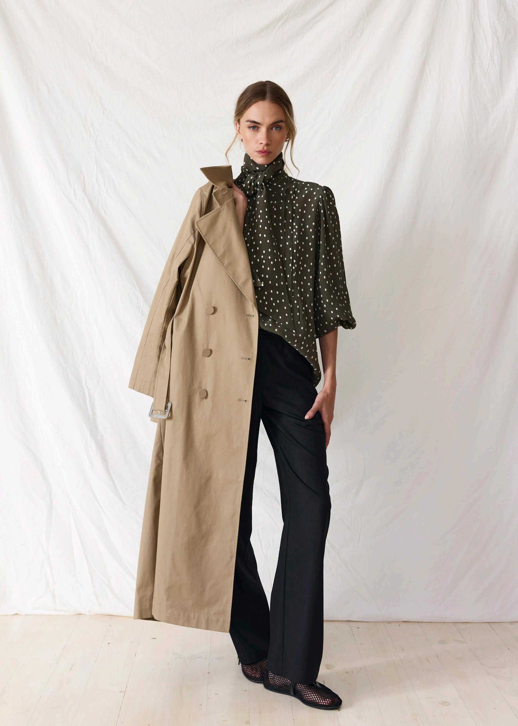 #5155 finella trench. black options. biscotti #3583 june shirt. chalk options. chalk spot + olive stripe + olive #8310 eliza skirt. black spot options. olive + olive spot + black