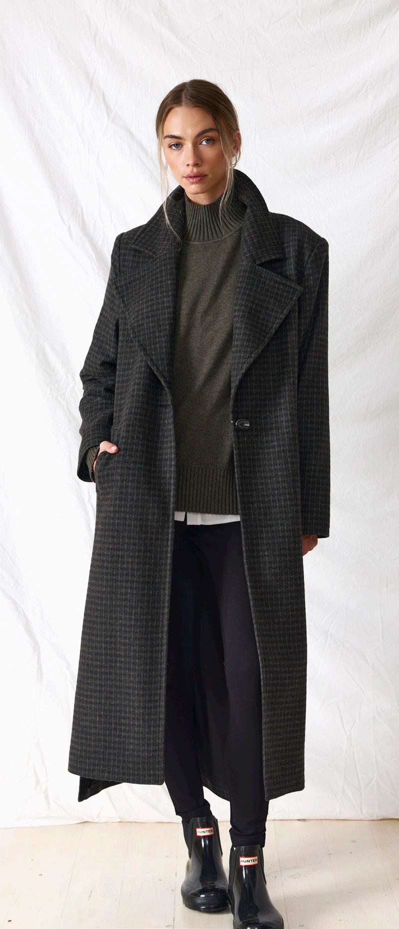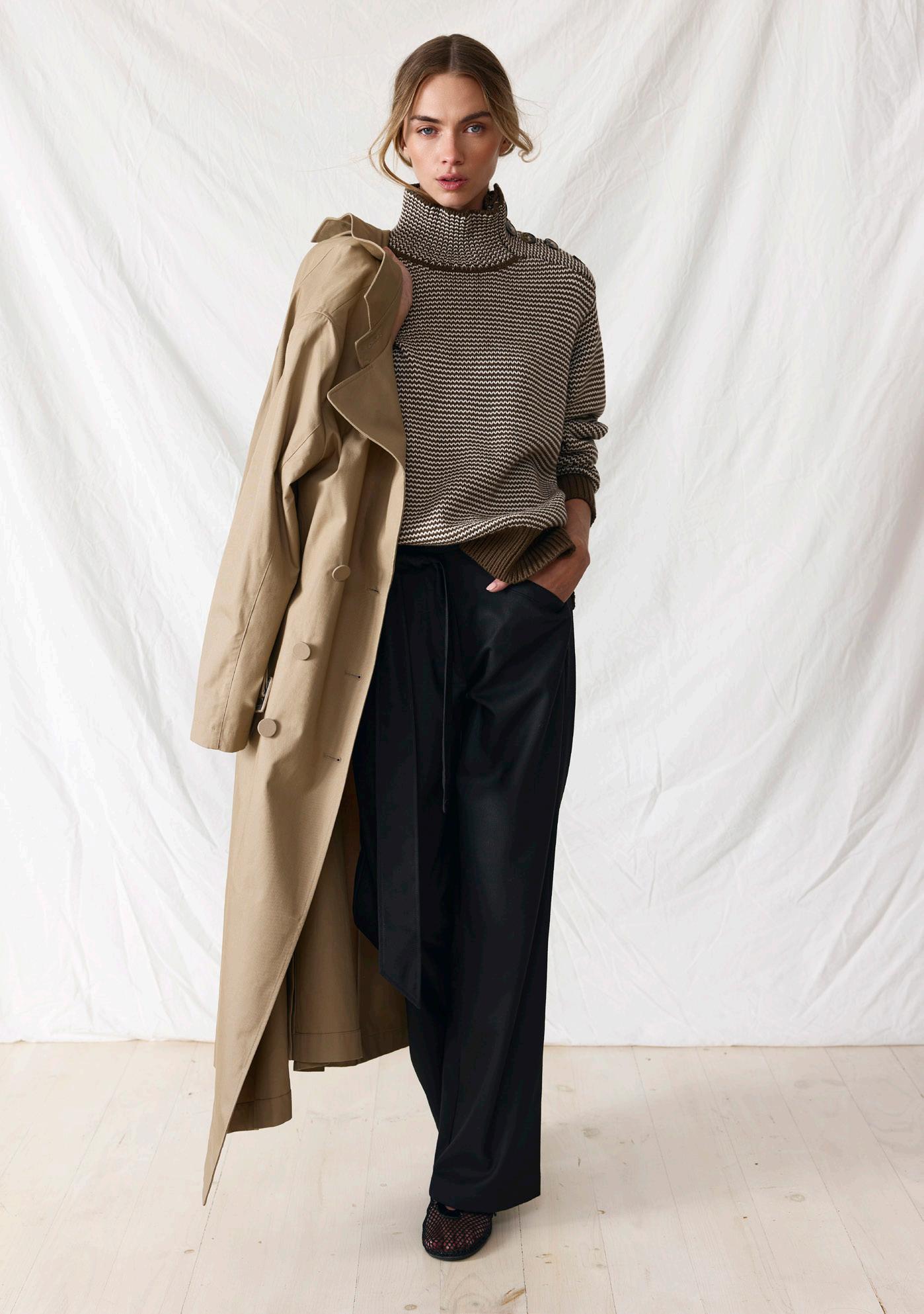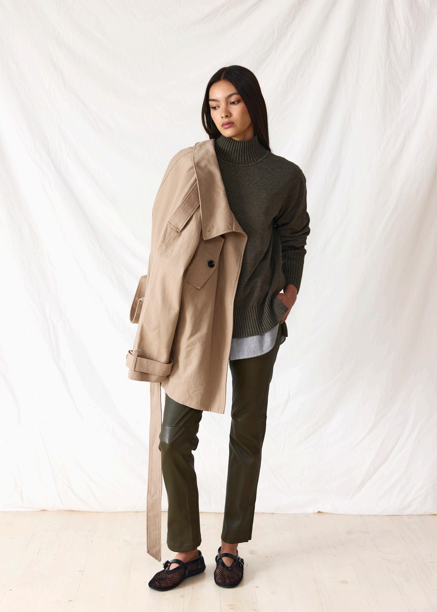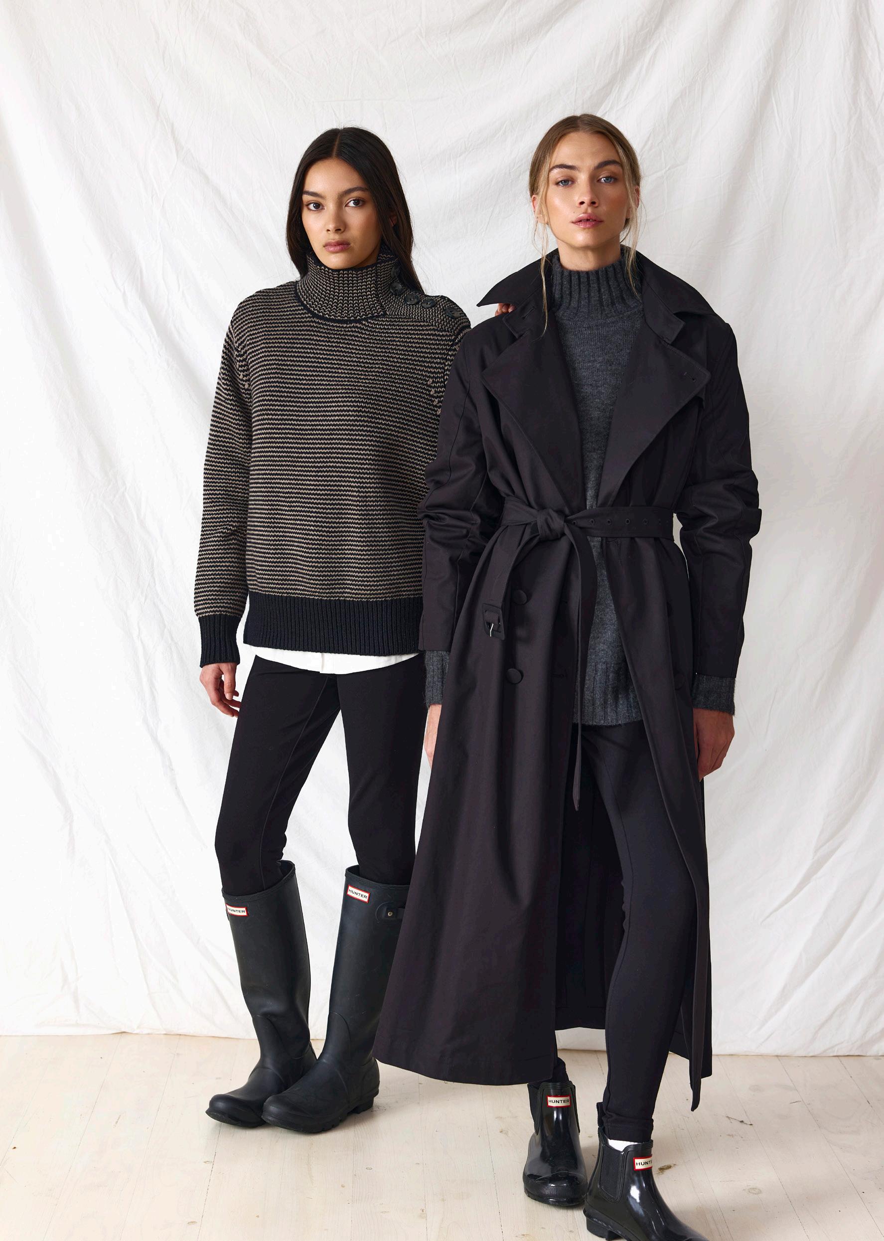 #5155 finella trench. black options. biscotti #7140 mae knit. heather grey #9665 lola legging. black