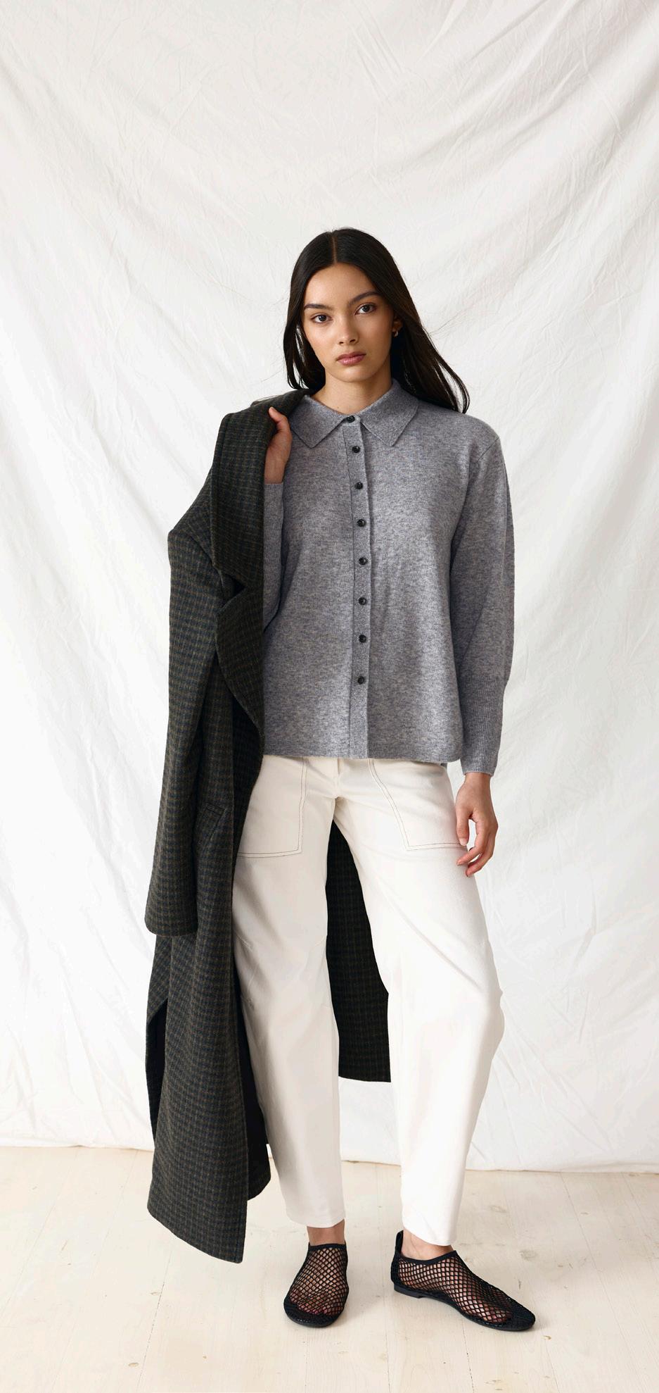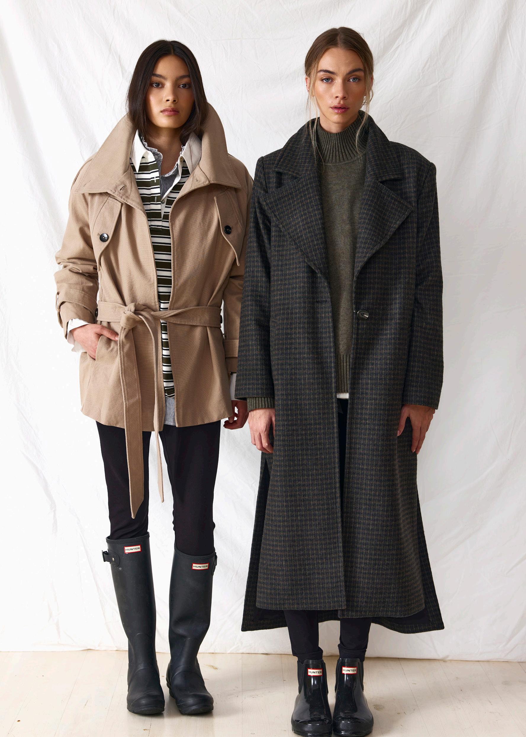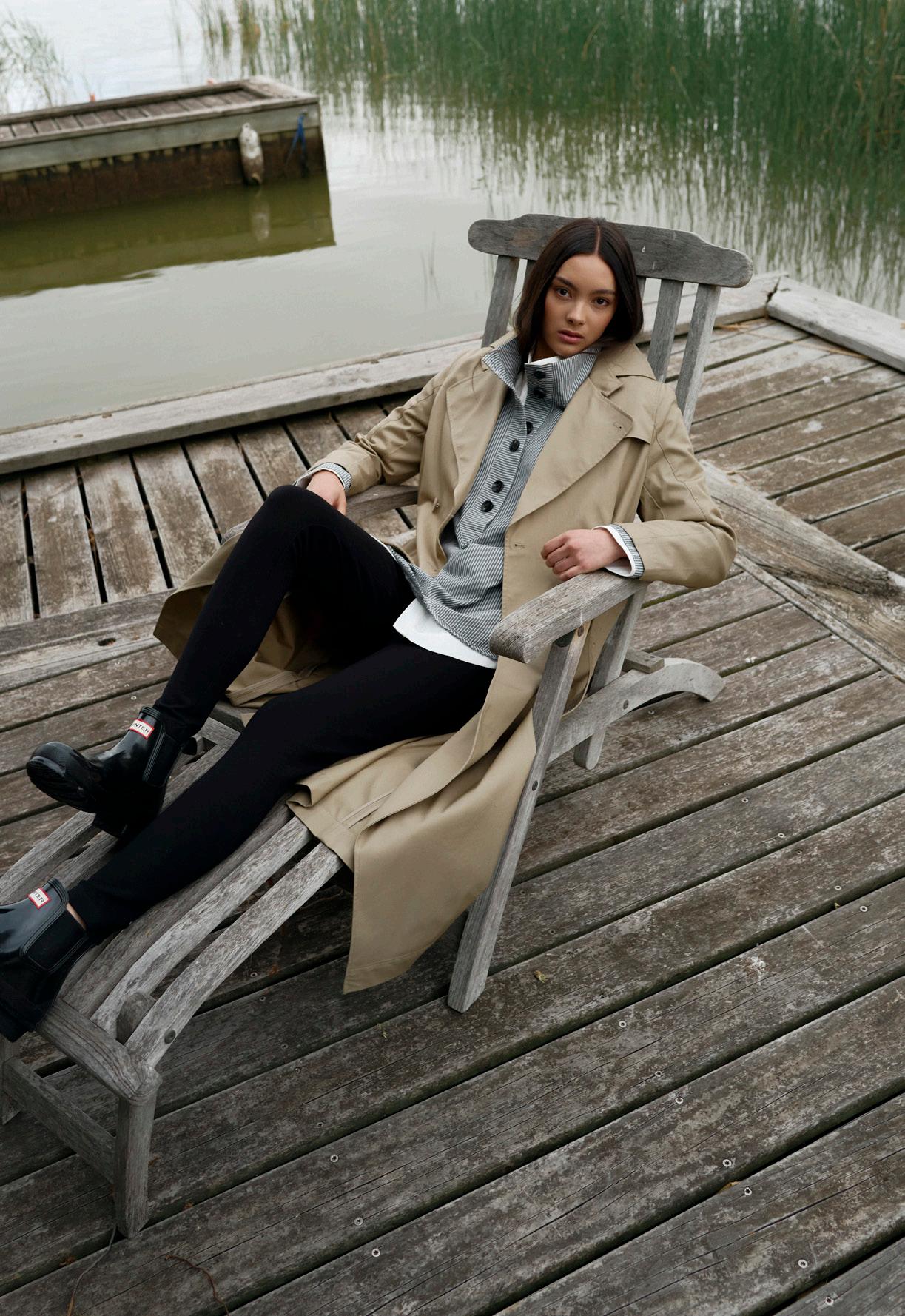 #5155 finella trench. black options. biscotti #7140 mae knit. heather grey #9665 lola legging. black