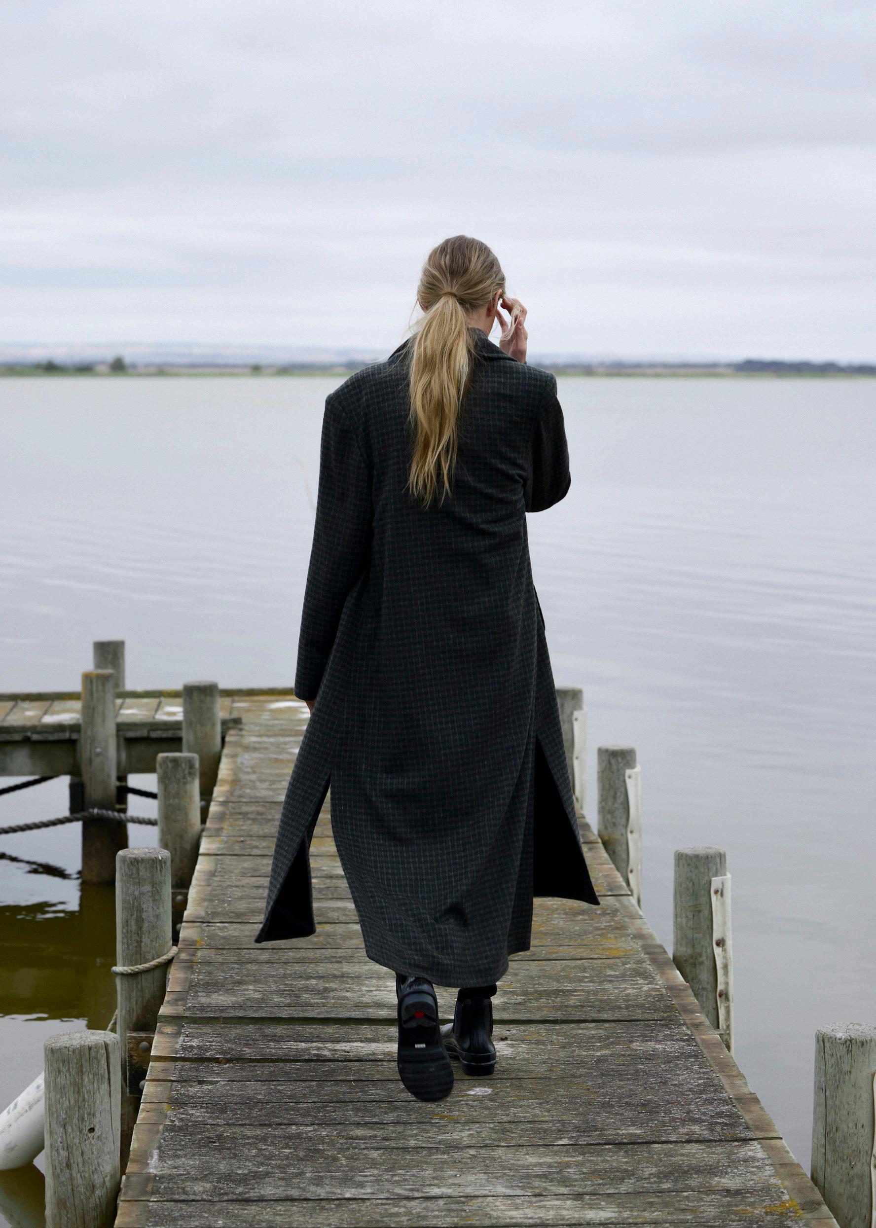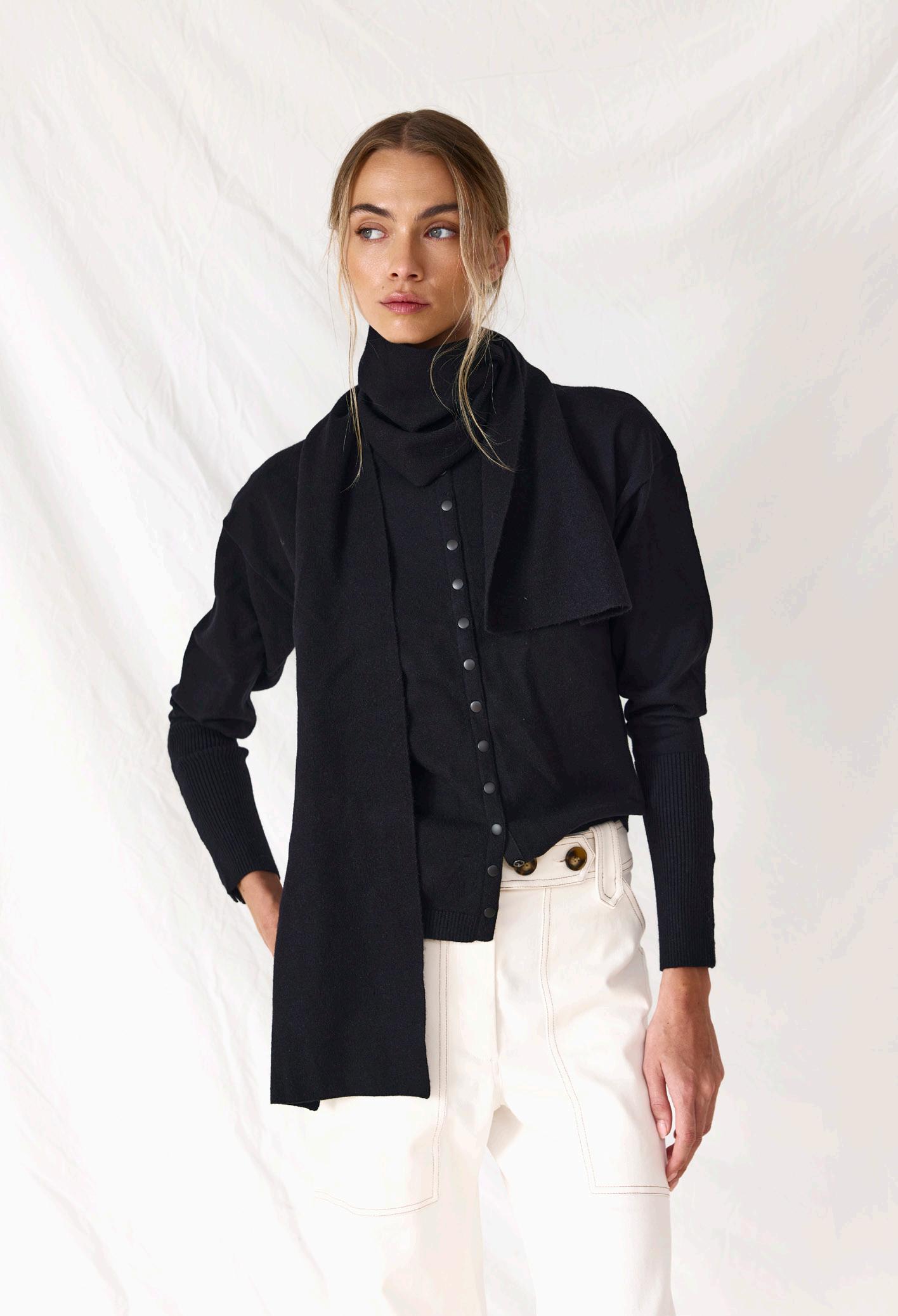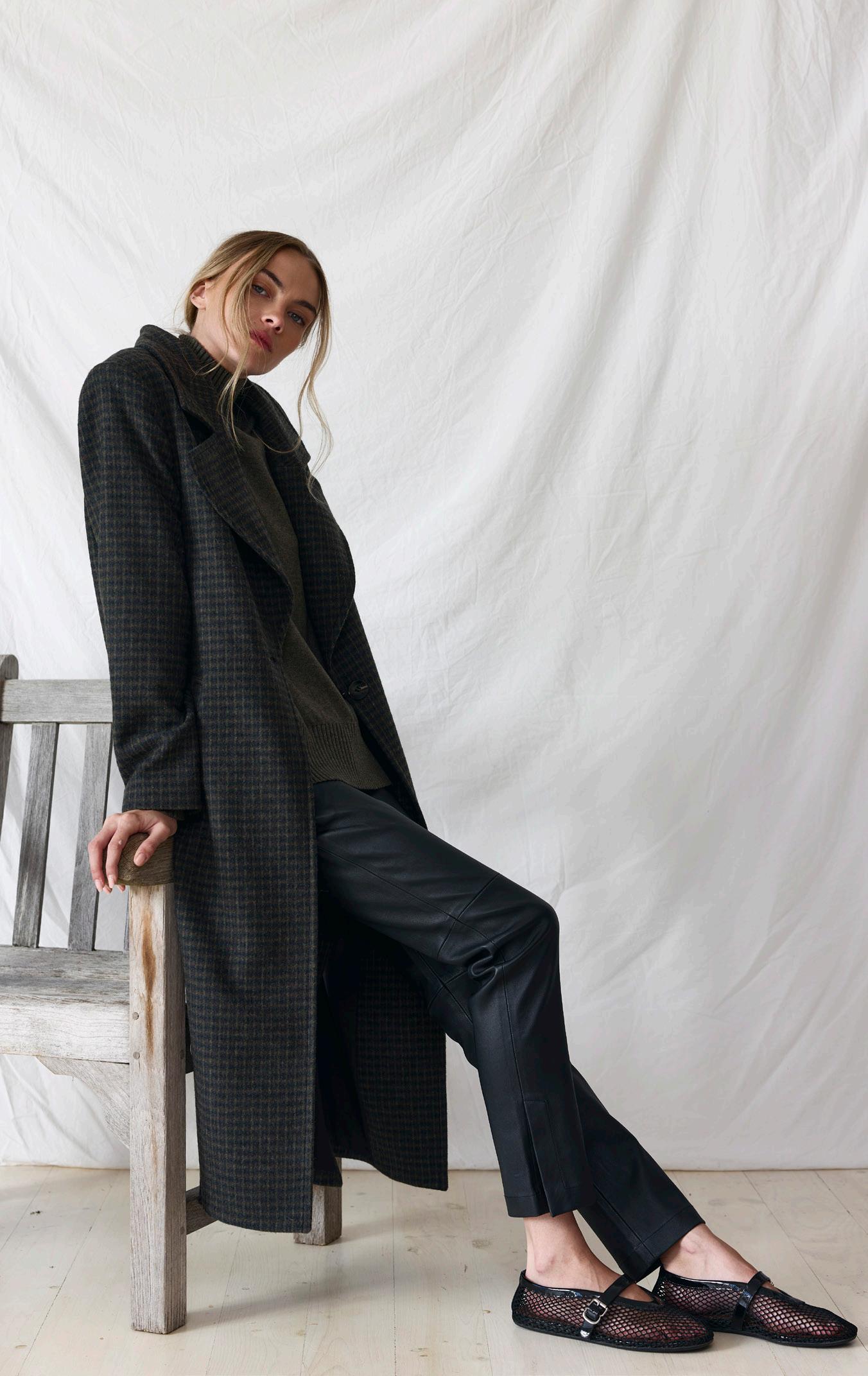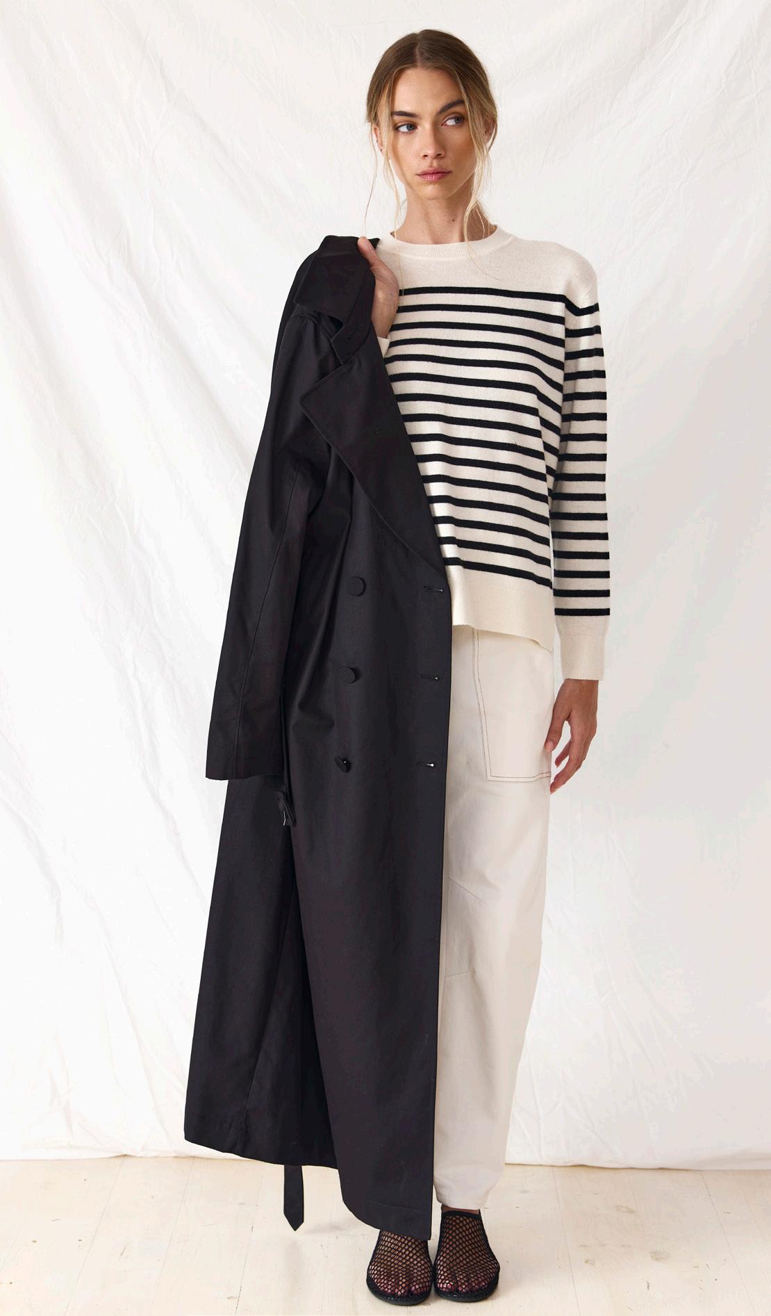 #5155 finella trench. black options. biscotti #7140 mae knit. heather grey #9665 lola legging. black