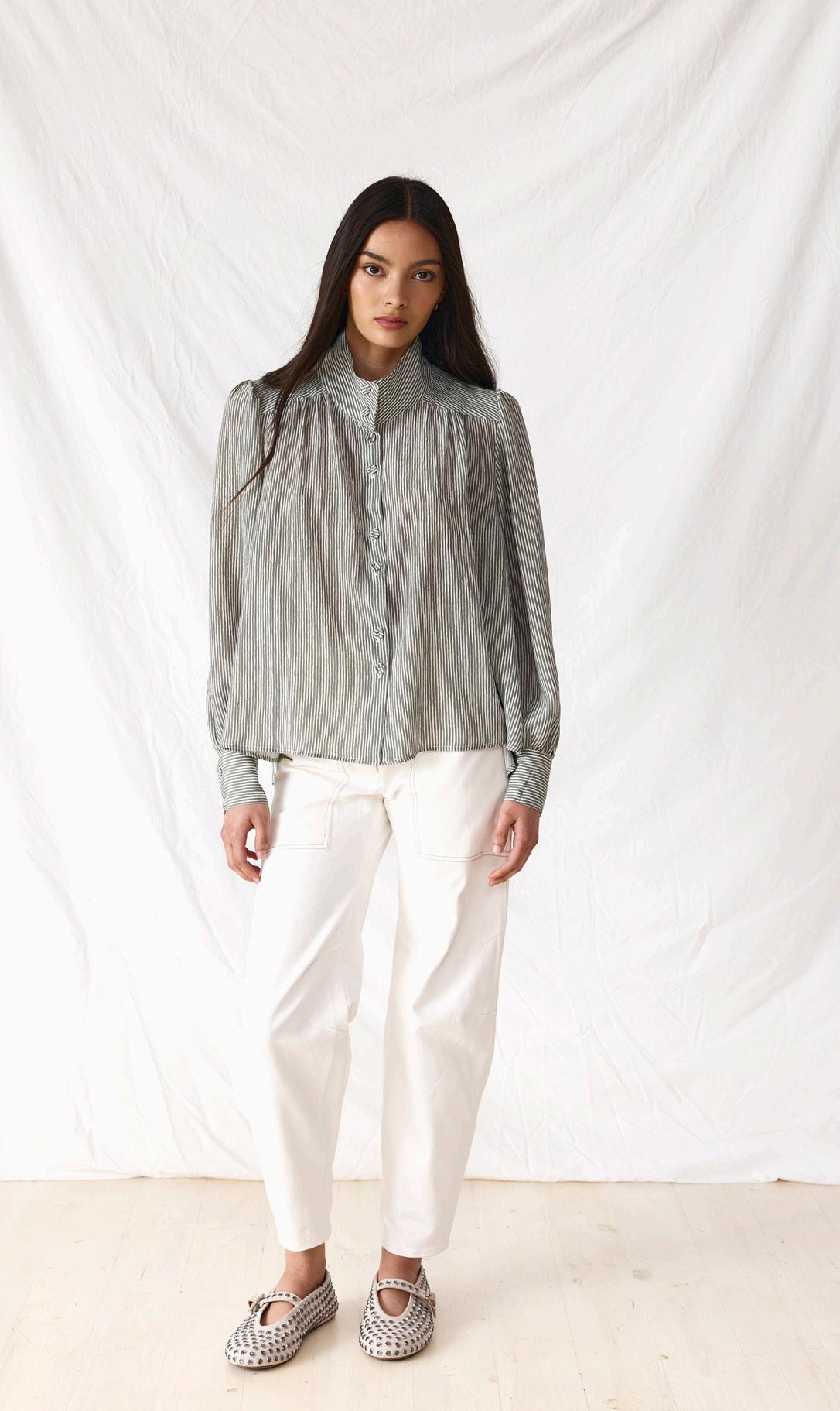#3592 mene shirt. olive stripe #9669 leo pant. chalk